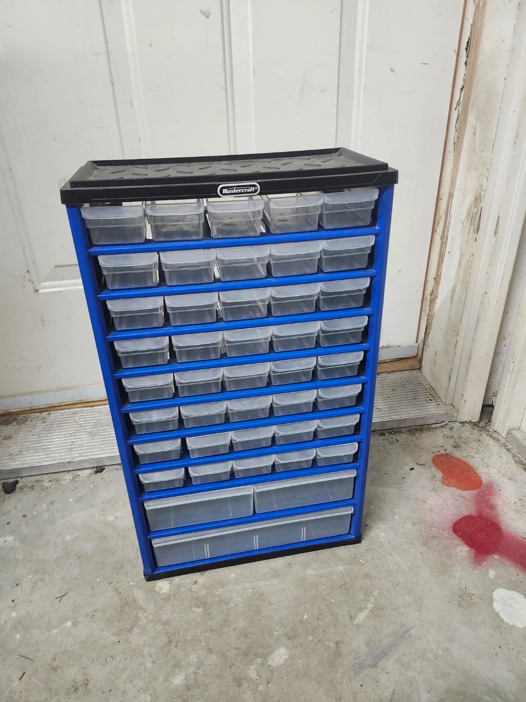 This Mastercraft parts organizer cabinet is blue with a black top. It features 43 clear plastic drawers. Great for organizing small items like screws, nails, or craft supplies.