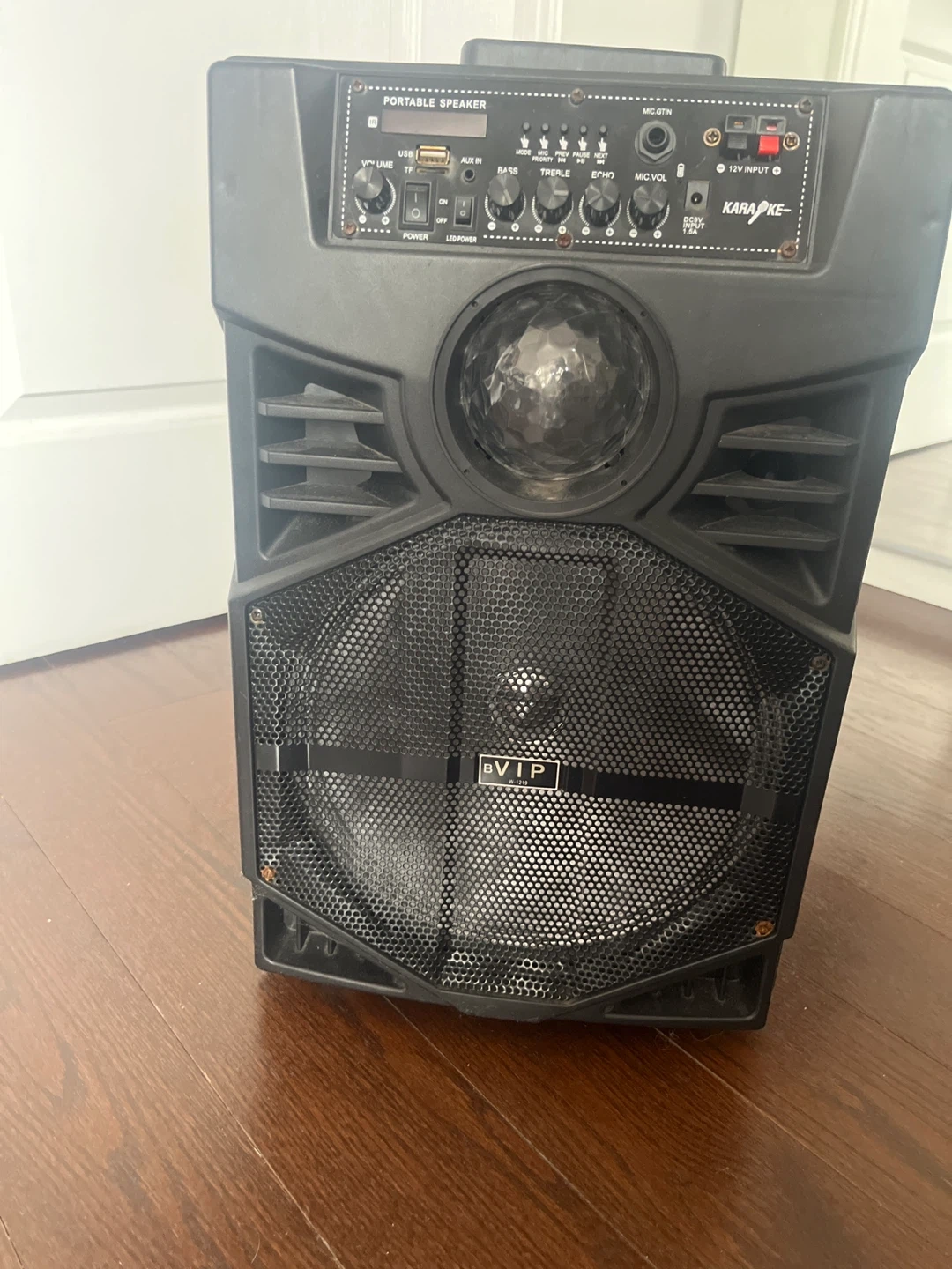 This is a VIP portable speaker with karaoke capabilities. It features USB and Aux inputs, along with bass, treble, and echo controls. It also has a built-in LED light.