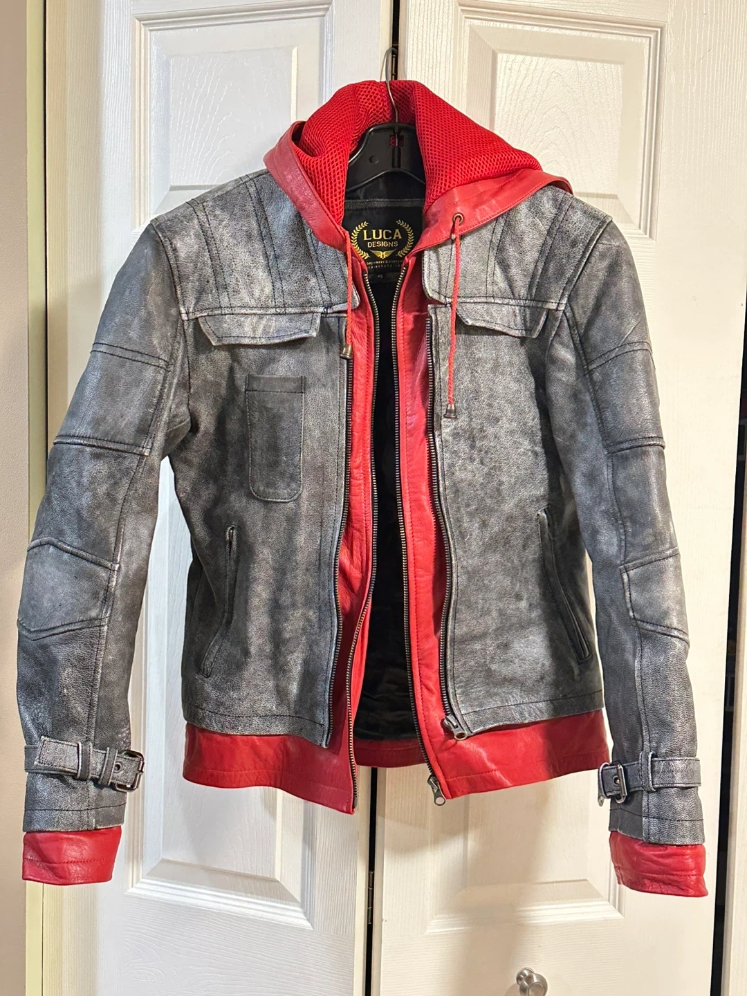 Selling a Luca Designs Red Hooded leather jacket. It's grey and red, with a striking design. Perfect for fans or anyone looking for a unique piece!