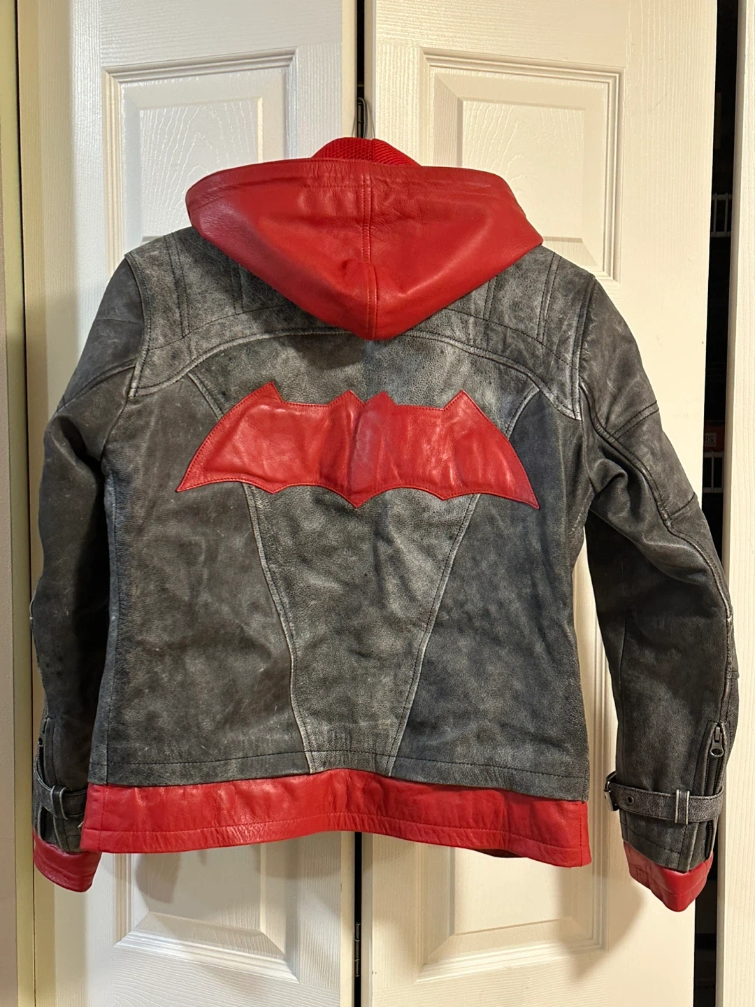 Selling a Luca Designs Red Hooded leather jacket. It's grey and red, with a striking design. Perfect for fans or anyone looking for a unique piece!