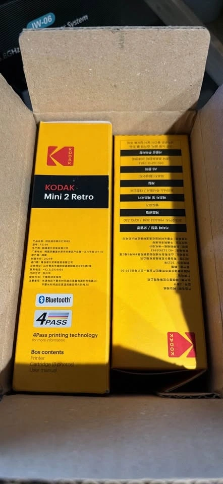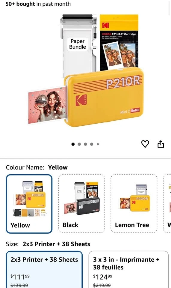 KODAK Mini 2 Retro portable Bluetooth photo printer in yellow. Uses 4Pass Technology for superior, long-lasting photo quality that's fingerprint and water-resistant. Print photos with or without borders. Download the KODAK Photo Printer app for fun AR features, filters, and frames. Compact and easy to carry for printing memories on the go. This bundle includes 38 sheets.