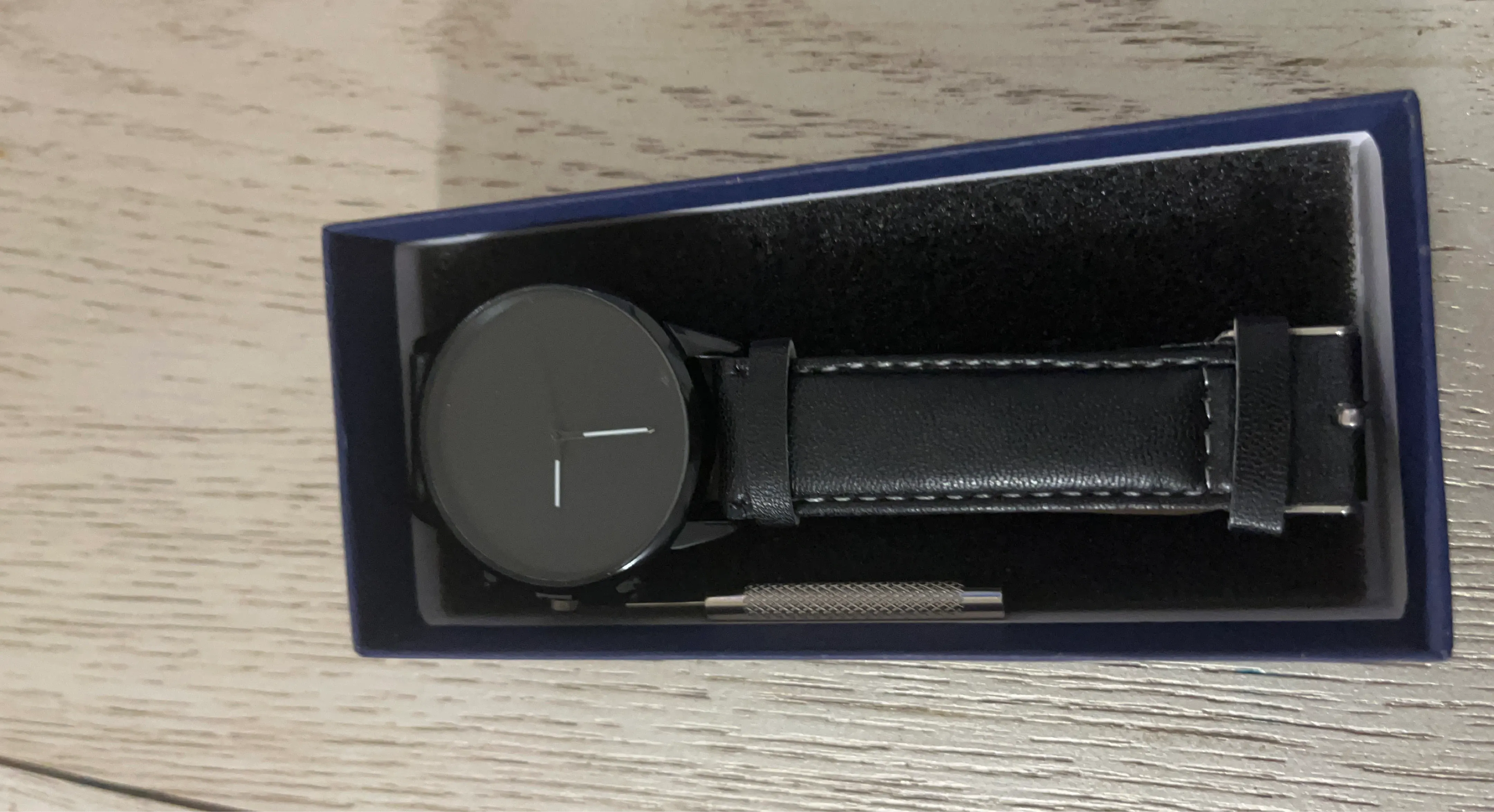 This is a black minimalist watch with a faux leather band. It includes a small tool for strap adjustments. Comes in a blue presentation box.
