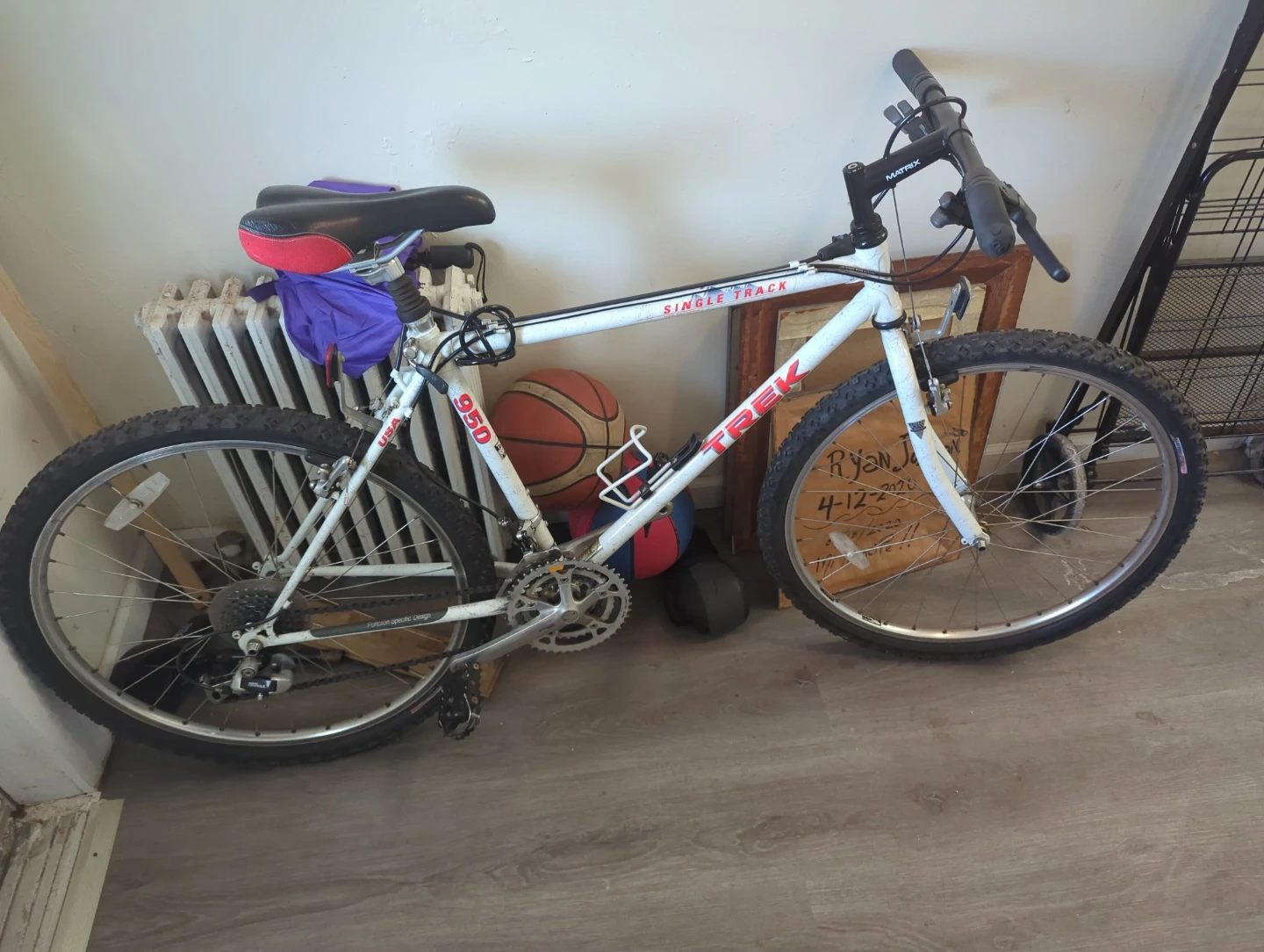 White Trek mountain bike with "Single Track" model designation. Features a metal frame, sturdy tires, and standard handlebar setup. This bike's components suggest it's built for varied terrain.