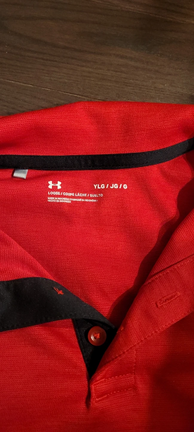 Under Armour red polo shirt with a black collar and button placket. Size YLG (Youth Large). This shirt is made for active wear.