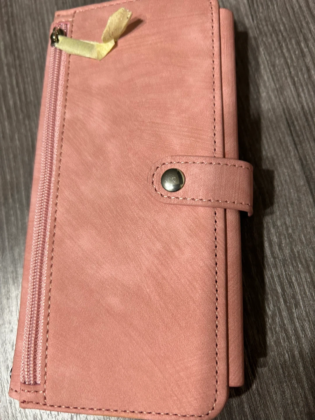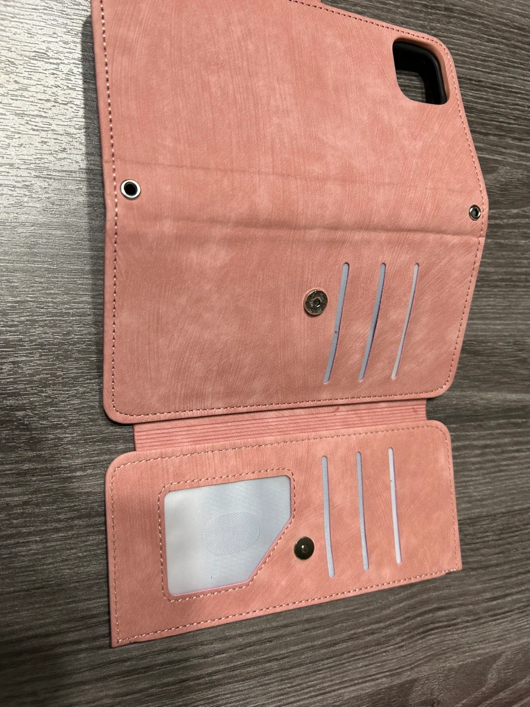 This wallet phone case is made from a soft pink faux leather material. It features multiple card slots and a zippered pocket. The interior has a secure snap closure to keep everything in place.