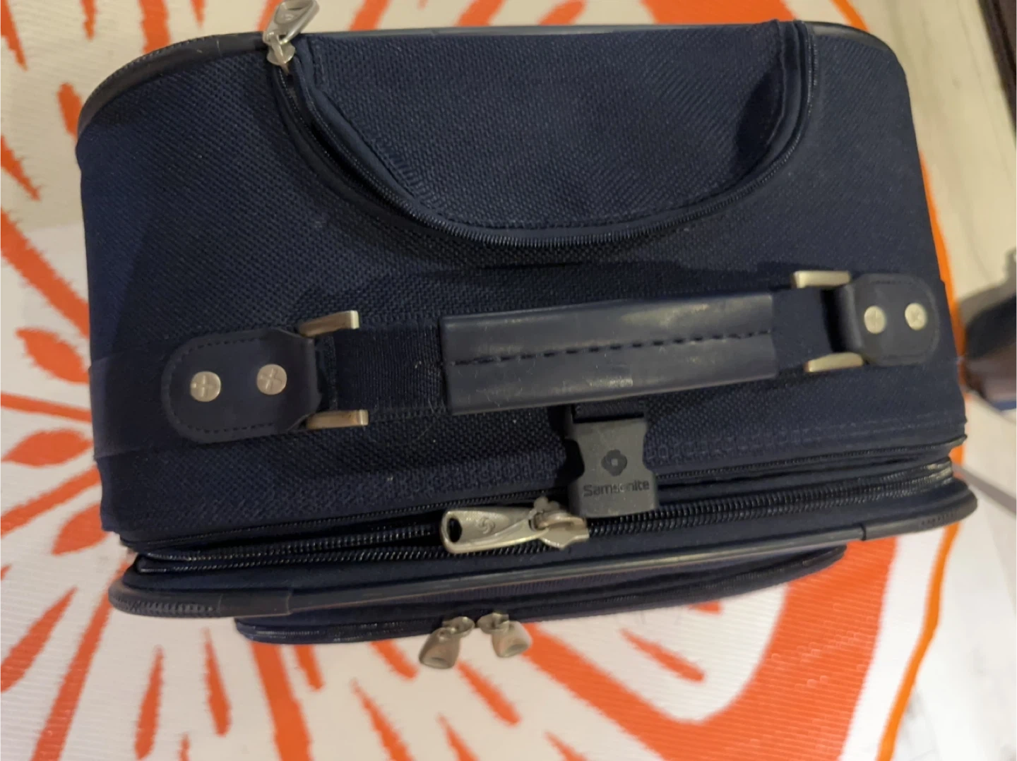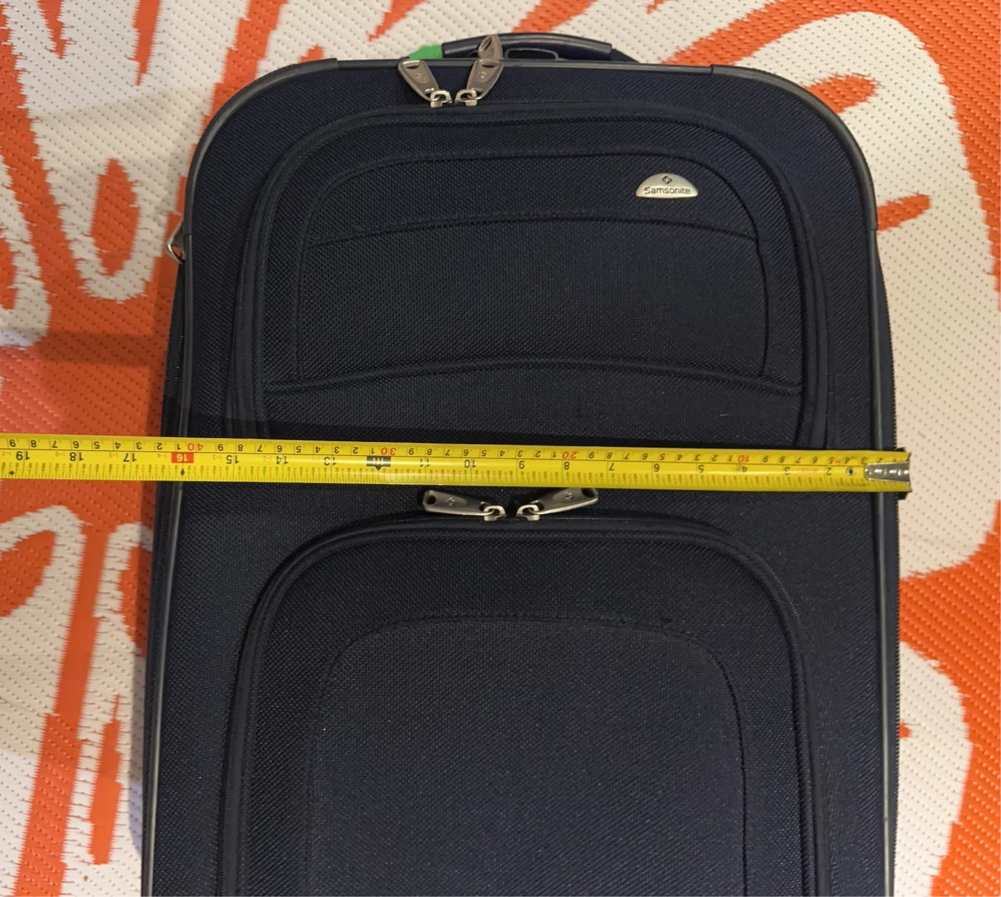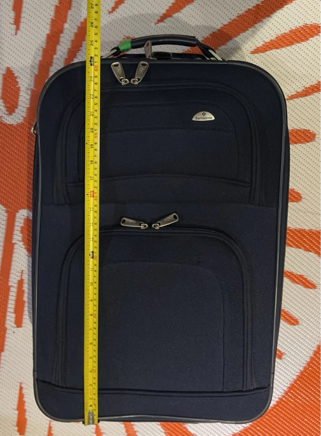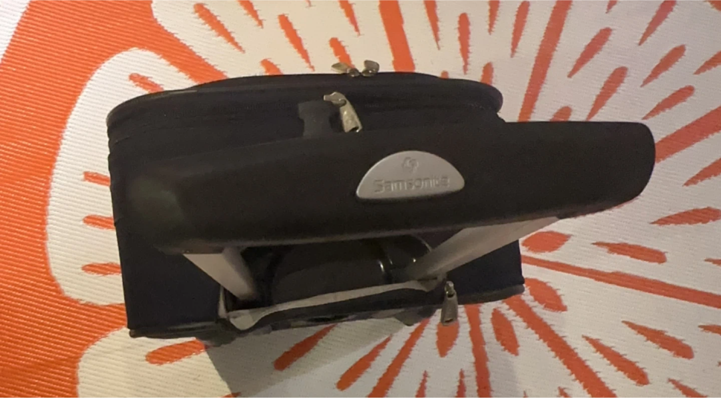 This is a Samsonite navy blue rolling suitcase. It measures approximately 25 inches tall and 17 inches wide. It's made of durable fabric and features smooth-rolling wheels. Only used one time short trip.