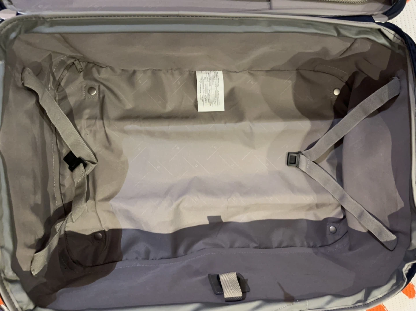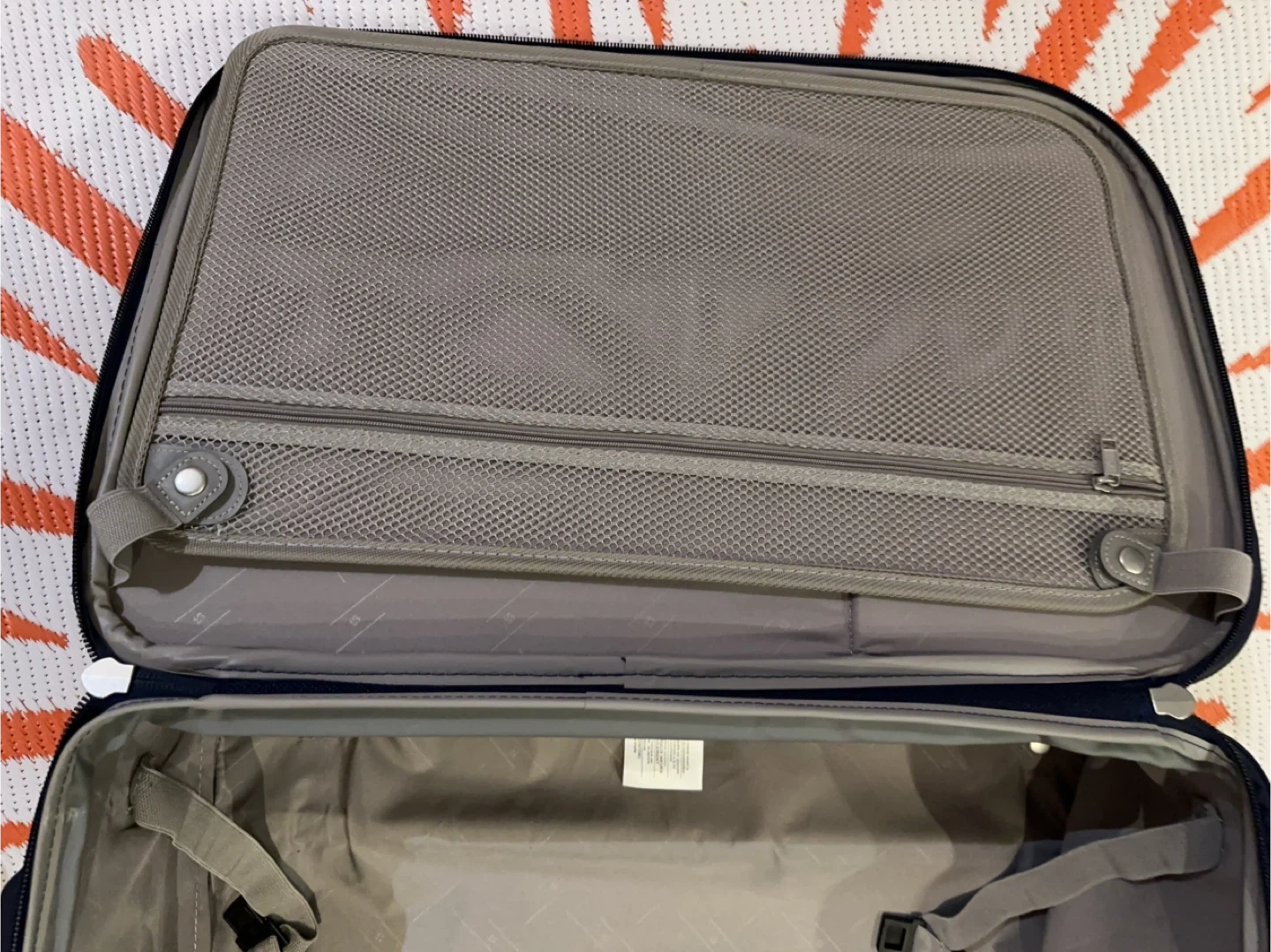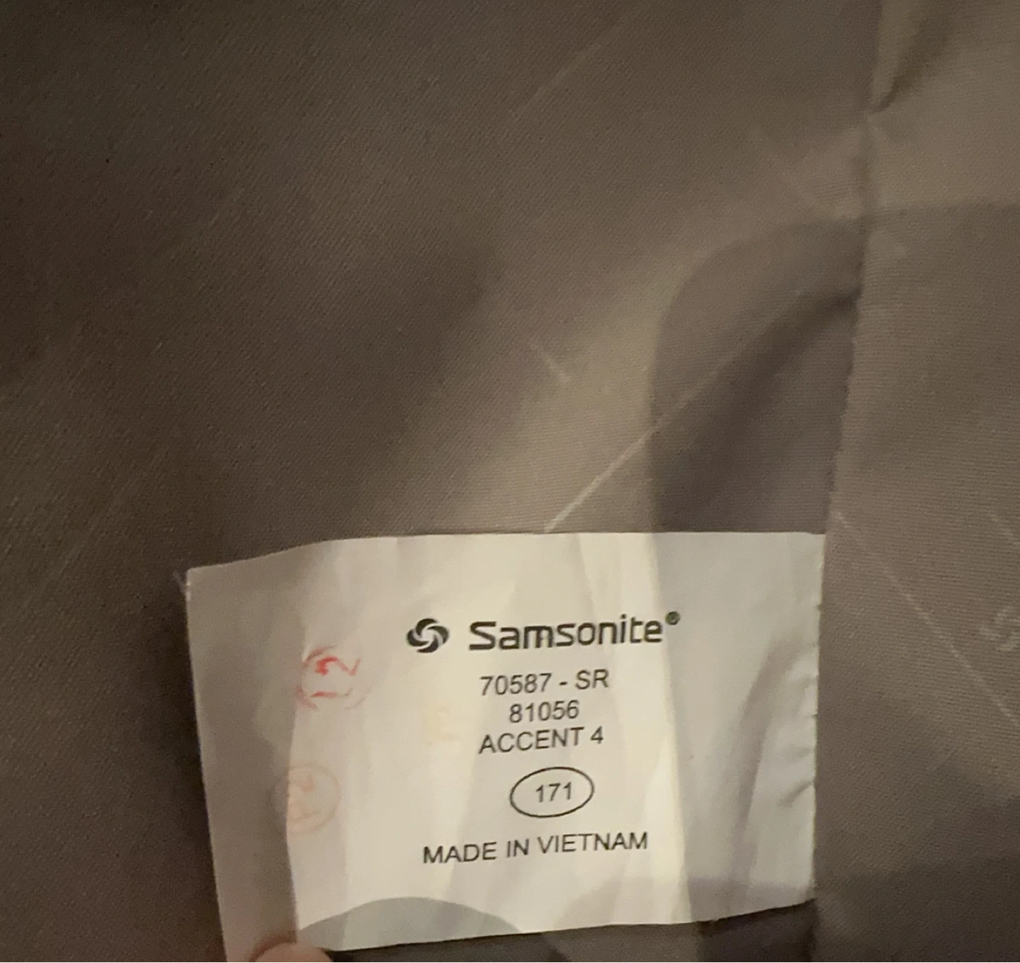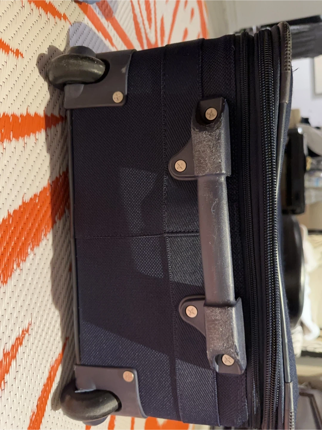 This is a Samsonite navy blue rolling suitcase. It measures approximately 25 inches tall and 17 inches wide. It's made of durable fabric and features smooth-rolling wheels. Only used one time short trip.