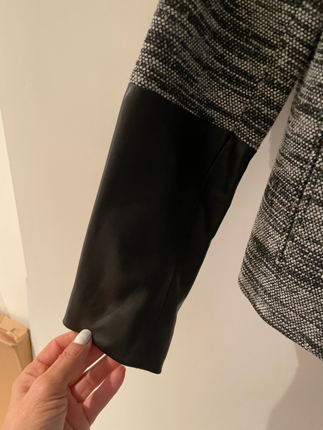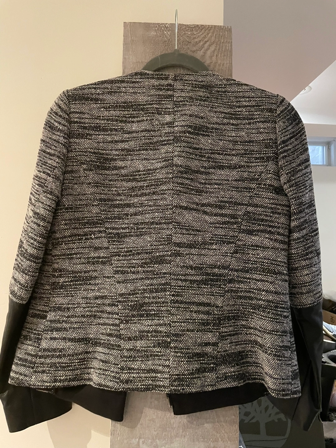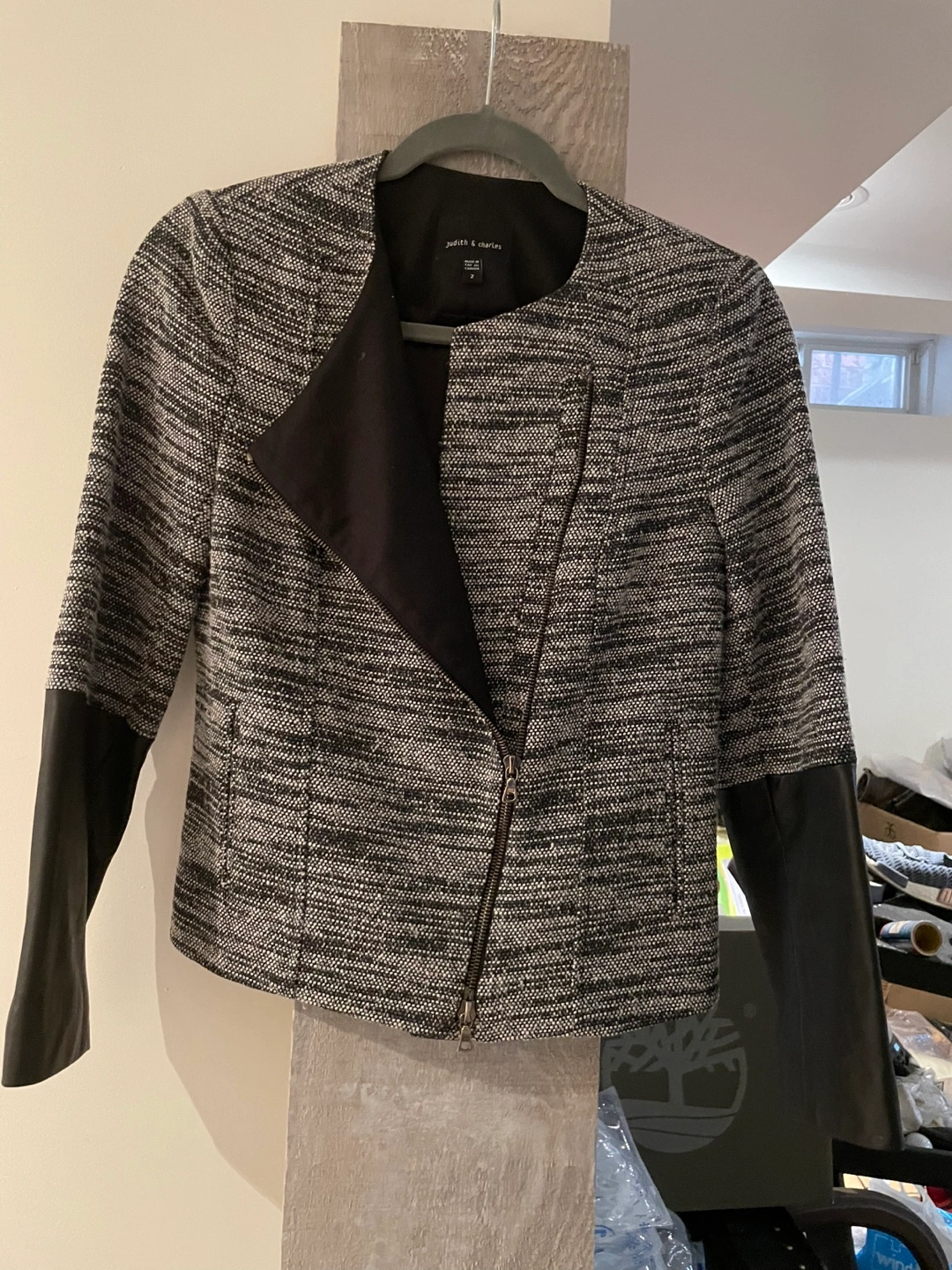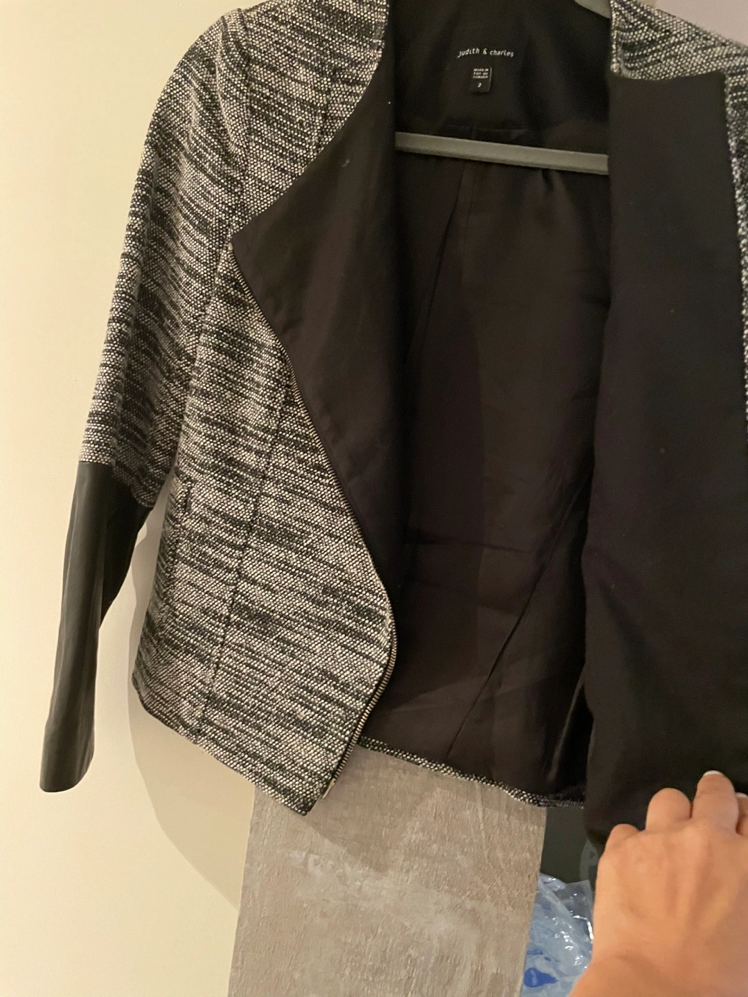 Selling a stylish Judith & Charles blazer in size 2! It features a unique design with black faux leather sleeves and a textured grey and black body. Perfect for adding a touch of sophistication to any outfit
