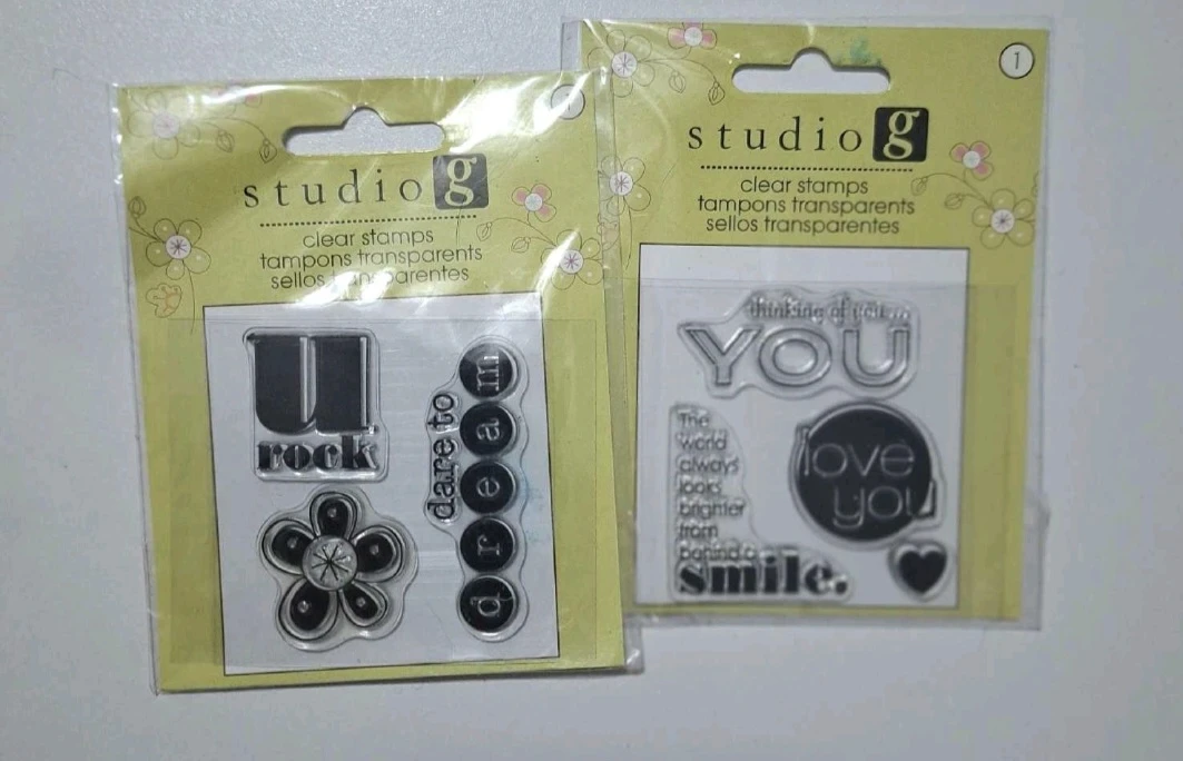 Two packs of Studio G clear stamps. They're brand new and still sealed in their original packaging! One pack has the words 'U rock' and 'dare to dream', while the other has 'thinking of you', 'love you' and 'smile' designs. Perfect for your crafting projects!