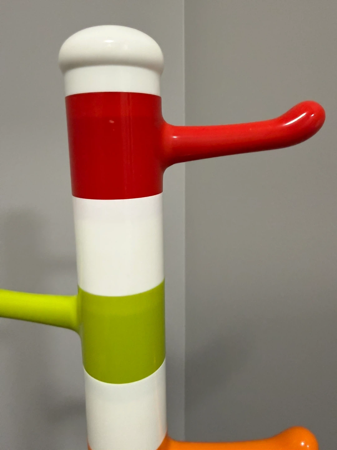 A fun and colourful coat rack with multiple hooks. It's great for hanging coats, hats, and bags. Perfect for a kid's room or a playful entryway!