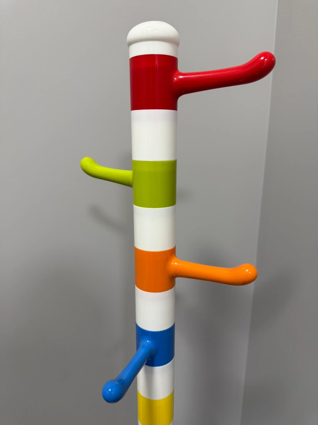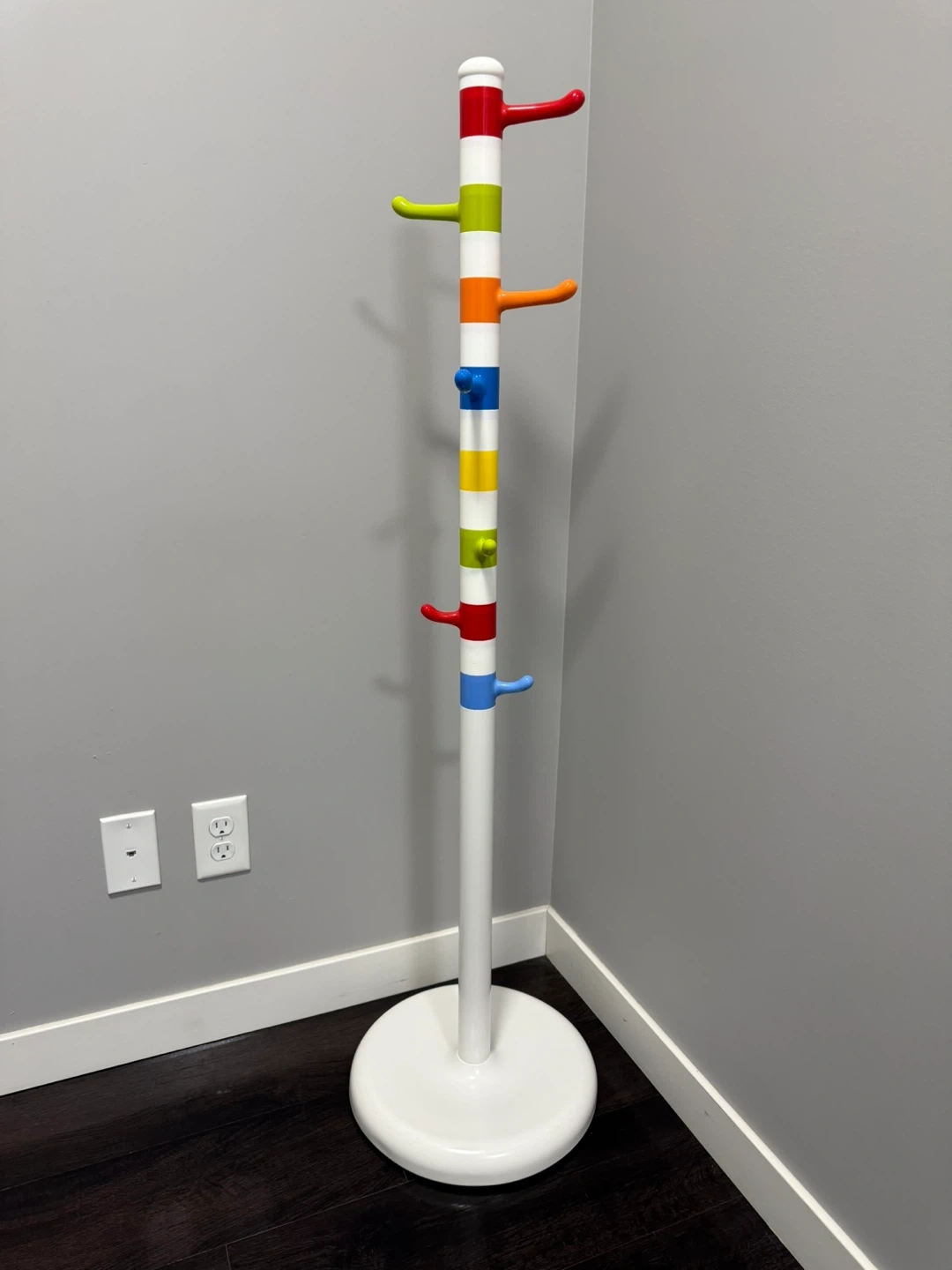 A fun and colourful coat rack with multiple hooks. It's great for hanging coats, hats, and bags. Perfect for a kid's room or a playful entryway!