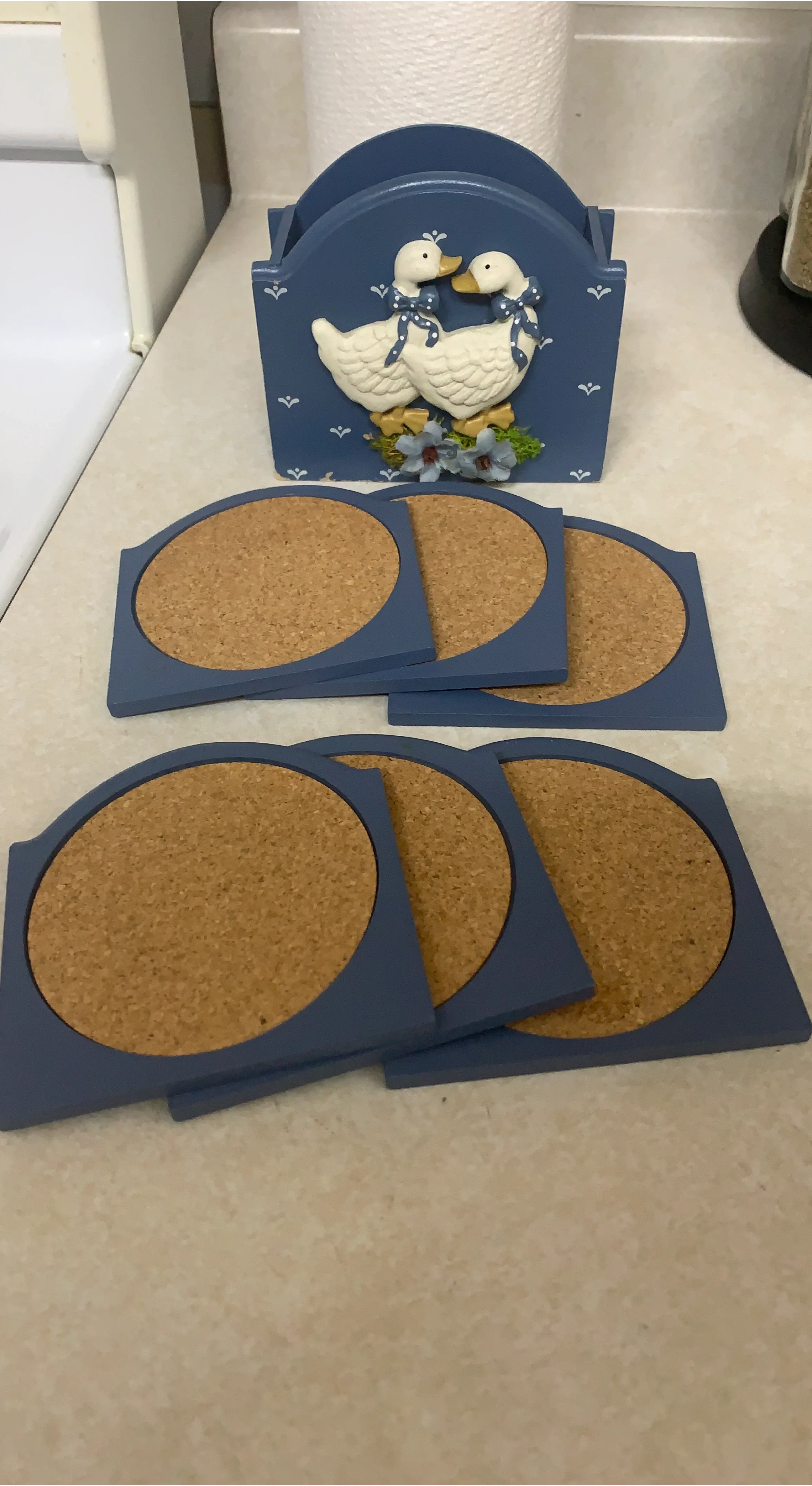 Cute wooden blue coaster set with a duck design holder! Includes six cork coasters with a blue trim. Perfect for adding a touch of charm to your table setting.