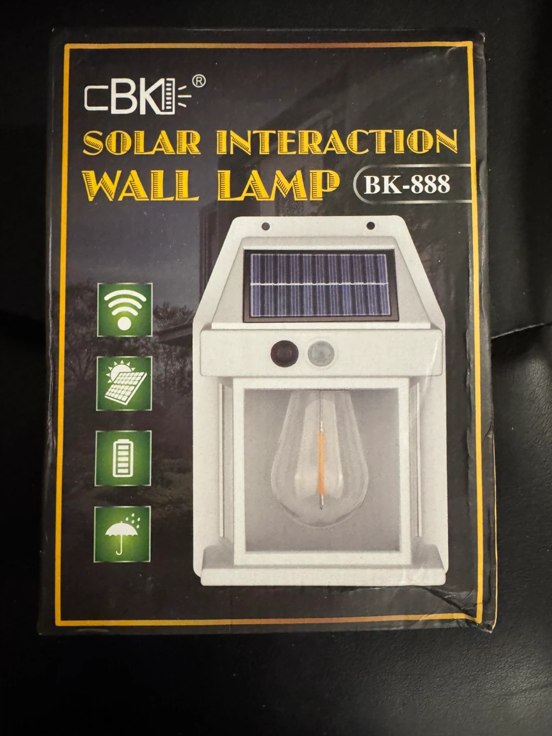 This CBKI Solar Interaction Wall Lamp BK-888 is orand new, still in its original packaging. It narnesses solar energy for an etticient and eco-friendly lighting solution. I think this will look great in your backyard.