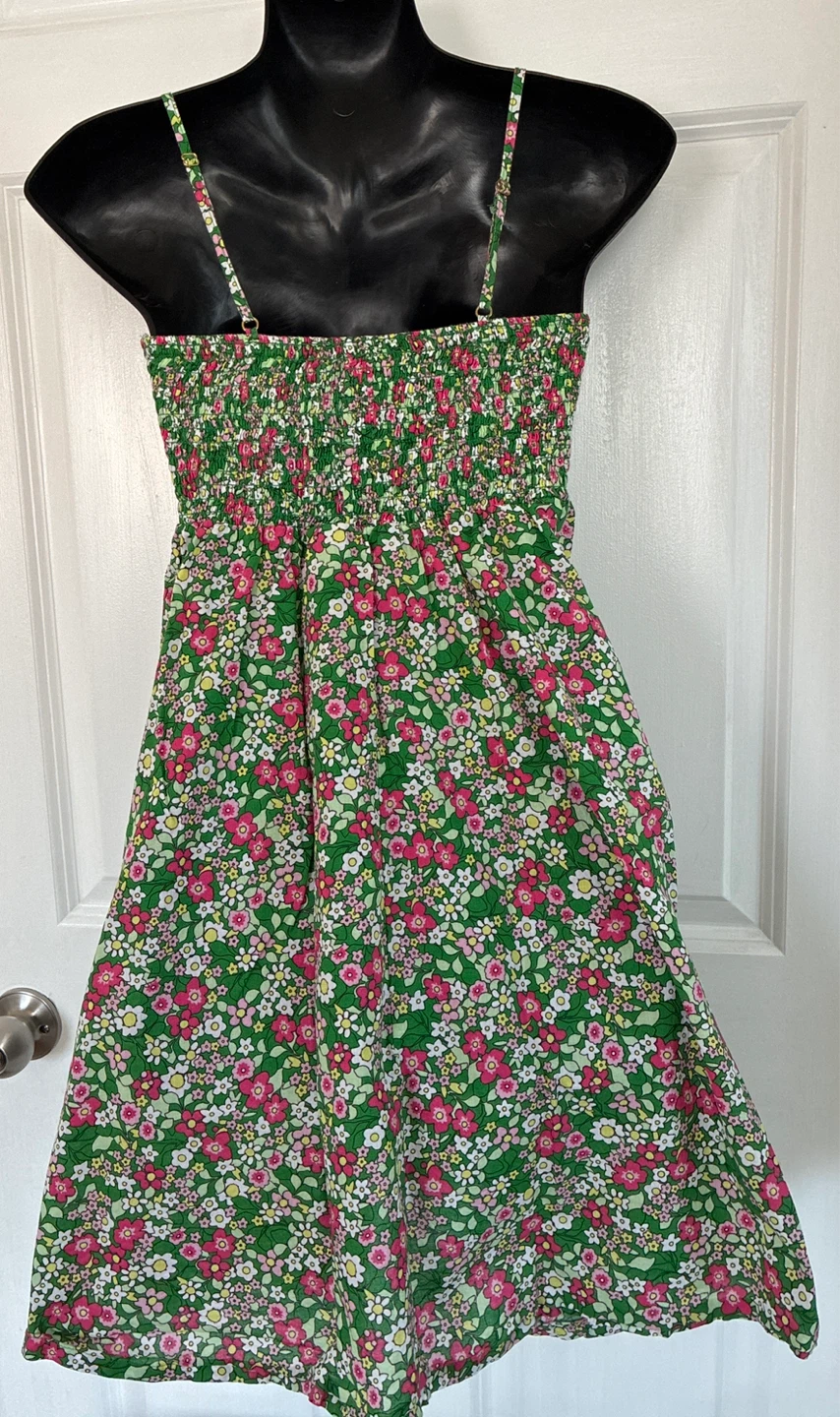 A cute green sundress with a colourful floral print and smocked back. It features adjustable spaghetti straps and a gathered bust with a tie detail. It's made of a lightweight fabric perfect for warmer days!