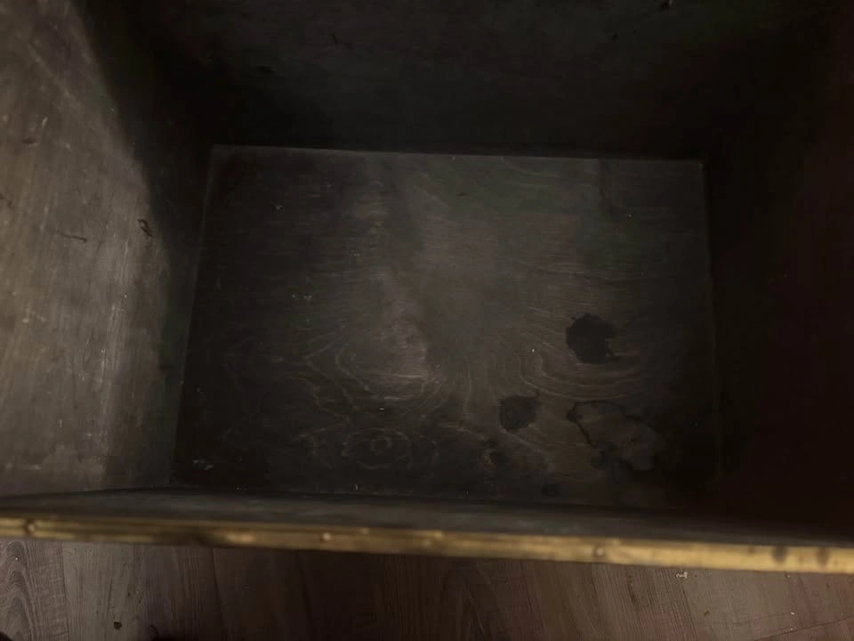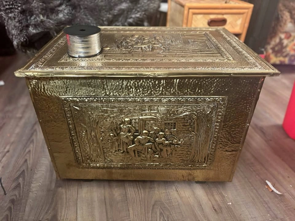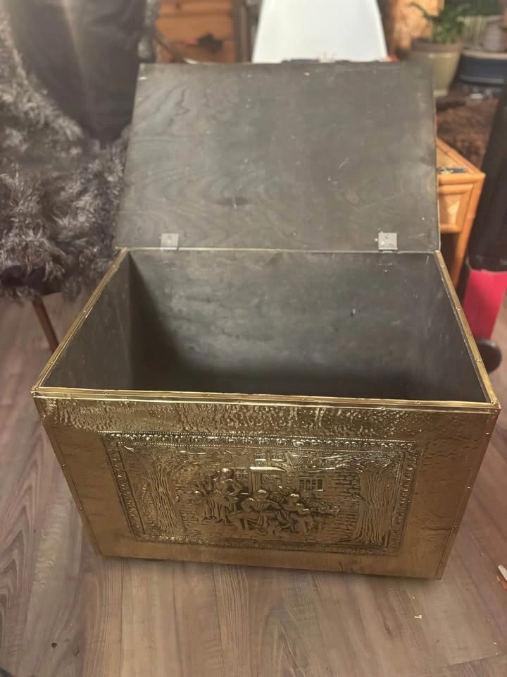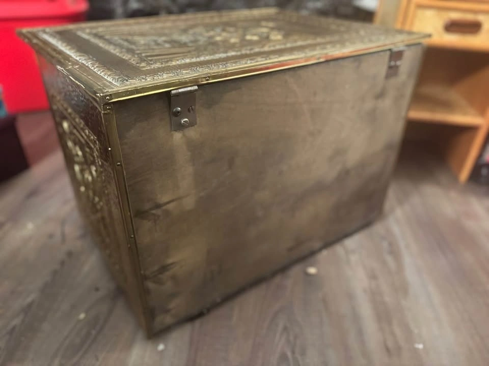 Awesome statement trunk with brass hardware and classic old-world charm. Solid, structured piece with beautiful brass corner accents and latch detailing. Perfect as a storage trunk, blanket chest, coffee table base, entryway piece, or bedroom accent, firewood, kindling, or coal chest. Measurements (approx): 23” length, 16” height, 16” width. Great size — substantial but not oversized. These brass-accent trunks retail quite high online, especially in this condition and size range. Ideal for: Living room coffee table styling, Blanket or linen storage, Toy chest, Entryway storage, Cottage / vintage / Ralph Lauren style décor. Structurally solid. Ready to use. This is a vintage, pre-owned piece, so it shows age-appropriate character including: surface patina, minor marks, small areas of paint residue, light wear consistent with age, visible nail impressions on the inside base from original construction. Look at photos for a complete picture. Nothing structurally compromising — solid and functional. The wear adds to its authentic vintage charm. Pickup by Kensington square in North Burnaby or by Parkgate in North Vancouver.
