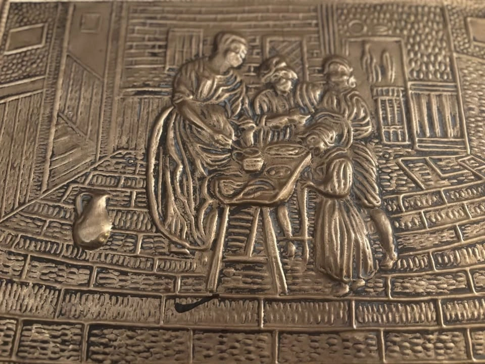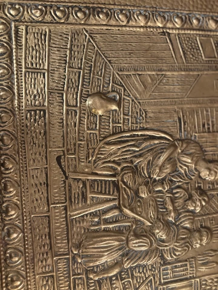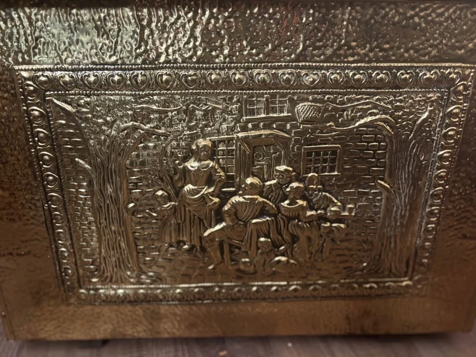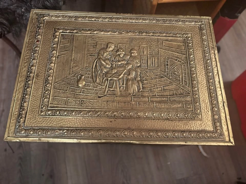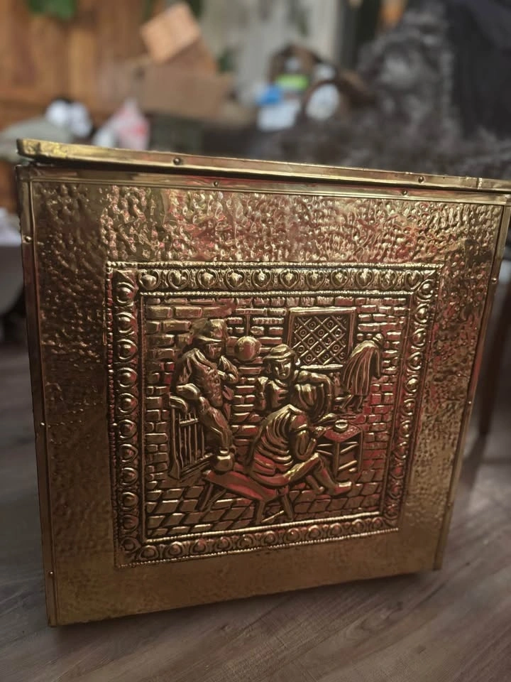 Awesome statement trunk with brass hardware and classic old-world charm. Solid, structured piece with beautiful brass corner accents and latch detailing. Perfect as a storage trunk, blanket chest, coffee table base, entryway piece, or bedroom accent, firewood, kindling, or coal chest. Measurements (approx): 23” length, 16” height, 16” width. Great size — substantial but not oversized. These brass-accent trunks retail quite high online, especially in this condition and size range. Ideal for: Living room coffee table styling, Blanket or linen storage, Toy chest, Entryway storage, Cottage / vintage / Ralph Lauren style décor. Structurally solid. Ready to use. This is a vintage, pre-owned piece, so it shows age-appropriate character including: surface patina, minor marks, small areas of paint residue, light wear consistent with age, visible nail impressions on the inside base from original construction. Look at photos for a complete picture. Nothing structurally compromising — solid and functional. The wear adds to its authentic vintage charm. Pickup by Kensington square in North Burnaby or by Parkgate in North Vancouver.