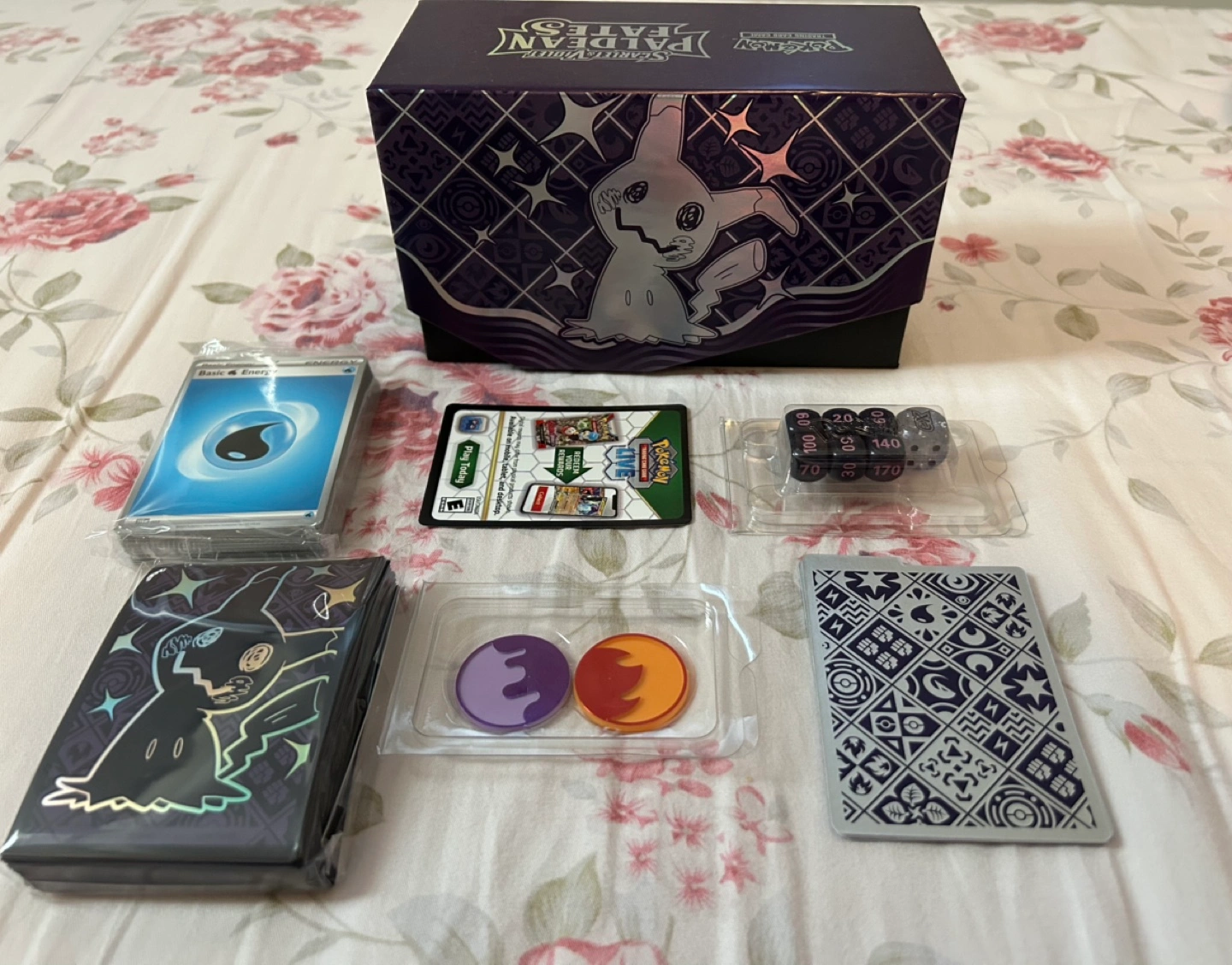 Pokemon Paldean Fates ETB opened, includes code card, energy cards, and dice. Everything in the picture is included.