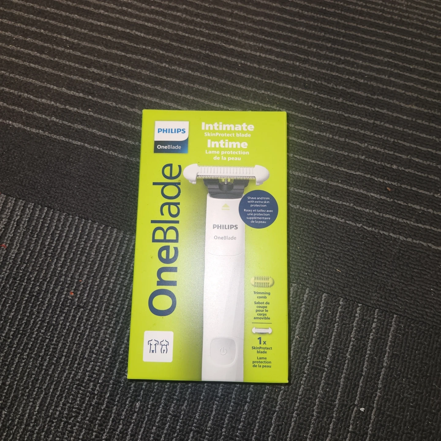 Philips OneBlade with SkinProtect blade for sensitive areas and intimate use. It's designed for shaving and trimming hair of any length. Includes a USB-A charging cable and a 3mm bi-directional trimming comb.