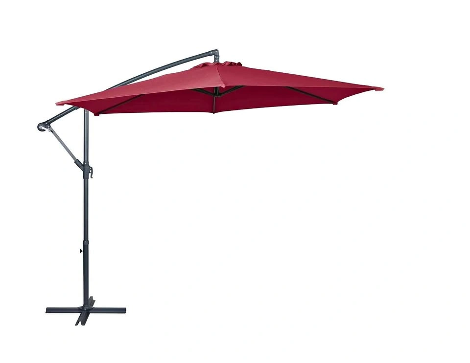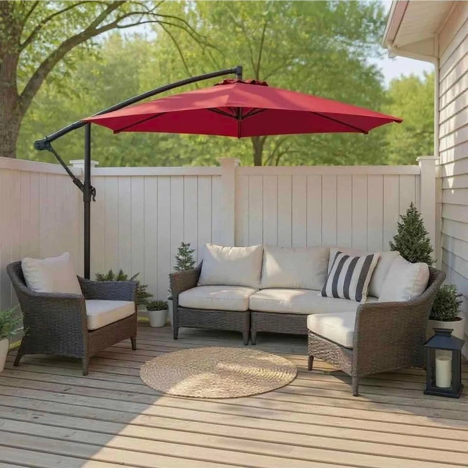 Experience outdoor dining without compromise with the AARHUS red cantilever umbrella, where innovative design meets superior sun protection. This striking chili pepper red umbrella revolutionizes patio shade by positioning its support pole to the side, leaving your entire table surface free for place settings, centerpieces, and uninterrupted conversation. The generous 250cm canopy creates a comfortable shaded oasis that easily covers six-person dining sets, while the vibrant colour adds a bold design element that energizes your outdoor space. Unlike traditional center-pole umbrellas that divide your table and limit seating arrangements, this red cantilever umbrella provides complete flexibility in how you use your patio furniture. Engineered for effortless sun tracking, this sophisticated red cantilever umbrella features full 360-degree rotation that lets you position shade exactly where needed as the sun moves across the sky. The smooth hand-crank system makes opening and closing simple for users of all abilities, while the adjustable height accommodates different furniture configurations and sun angles. Built with a sturdy metal pole and six steel ribs, the structure provides reliable support even on breezy days, enhanced by a wind vent that allows air to flow through rather than lifting the canopy. The UV-resistant polyester fabric blocks harmful rays while maintaining its vibrant colour season after season. Transform your outdoor living experience with a cantilever umbrella designed for real-world functionality and lasting performance. The water-repellent canopy sheds light rain to keep your gatherings dry, while the powder-coated frame resists rust and corrosion through years of weather exposure. When seasons change or storms approach, the detachable pole design allows for easy storage, protecting your investment. Whether shading poolside loungers, creating comfortable outdoor workspaces, or hosting memorable dinner parties, this versatile umbrella adapts to your lifestyle while providing the premium shade solution your outdoor oasis deserves. Base sold separately to ensure proper counterweight for your specific installation needs.