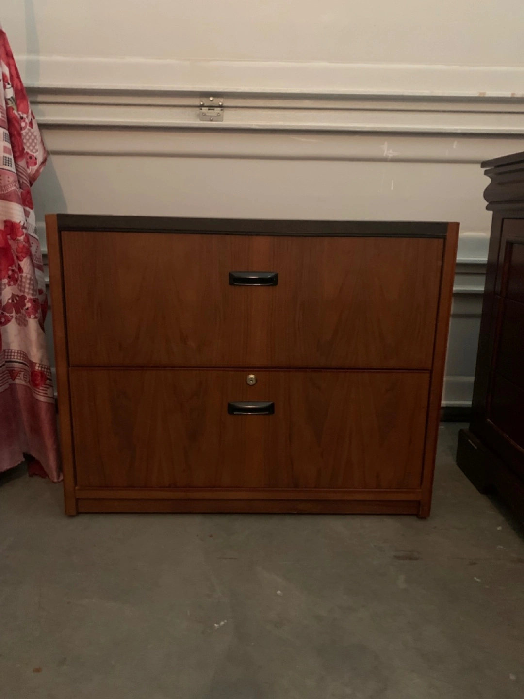 This used two-drawer dresser/filing cabinet is perfect for organizing your home or office, featuring a durable build and a classic wood finish. The drawers provide ample space for letter-size files. There are some signs of wear, but overall it's in good working condition. I have lost the key but easy to replaceable lock.