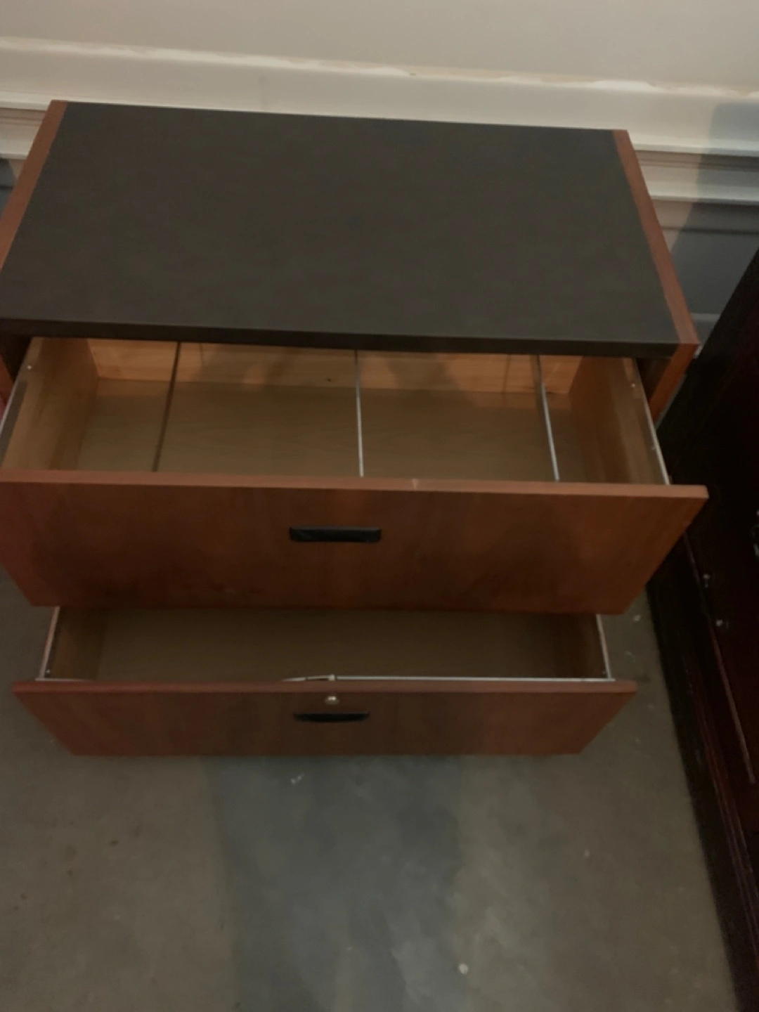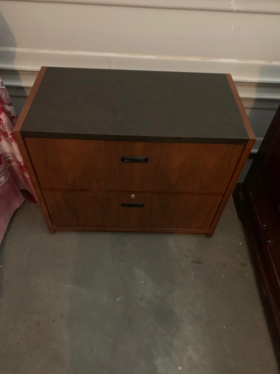 This used two-drawer dresser/filing cabinet is perfect for organizing your home or office, featuring a durable build and a classic wood finish. The drawers provide ample space for letter-size files. There are some signs of wear, but overall it's in good working condition. I have lost the key but easy to replaceable lock.