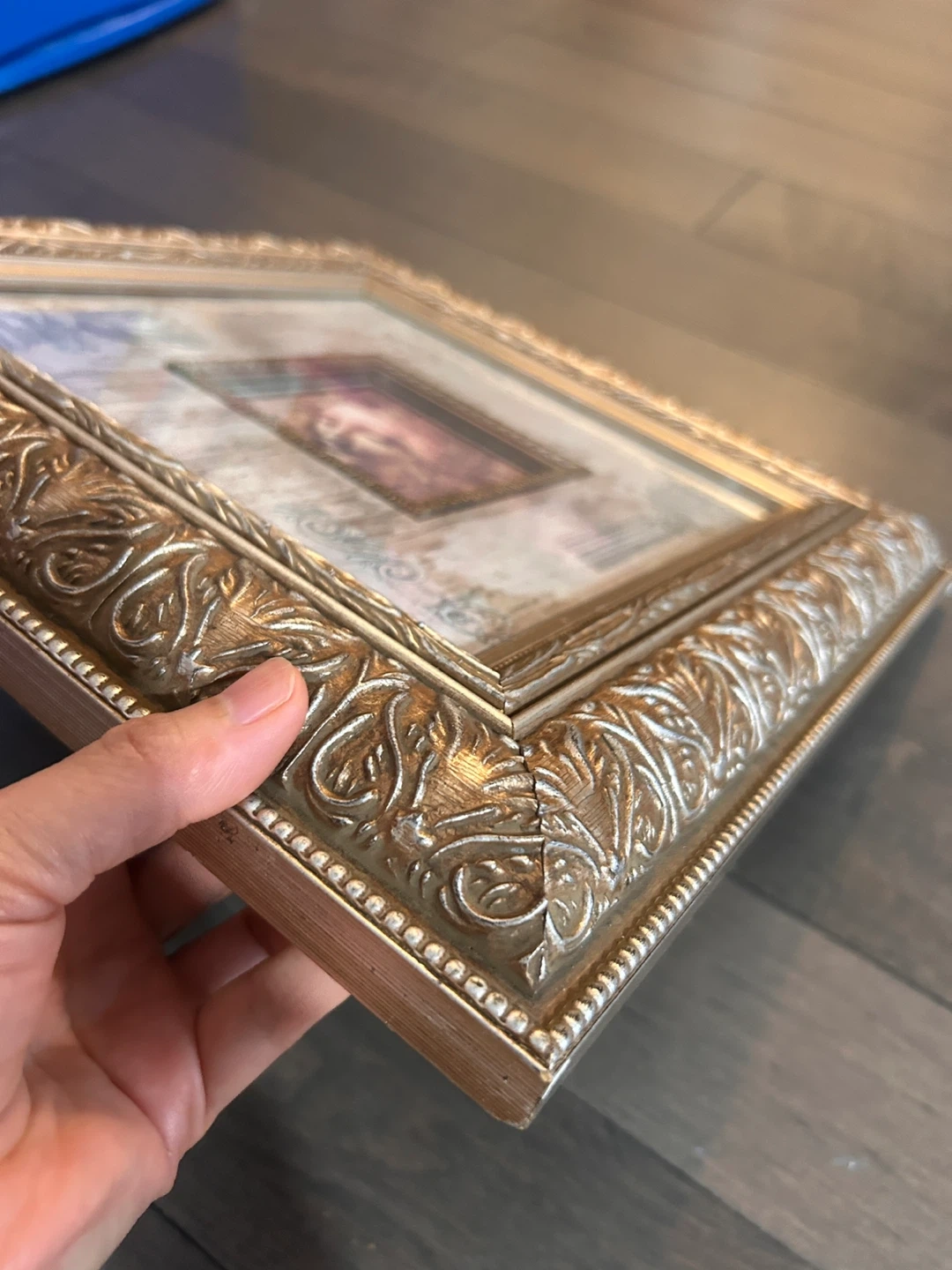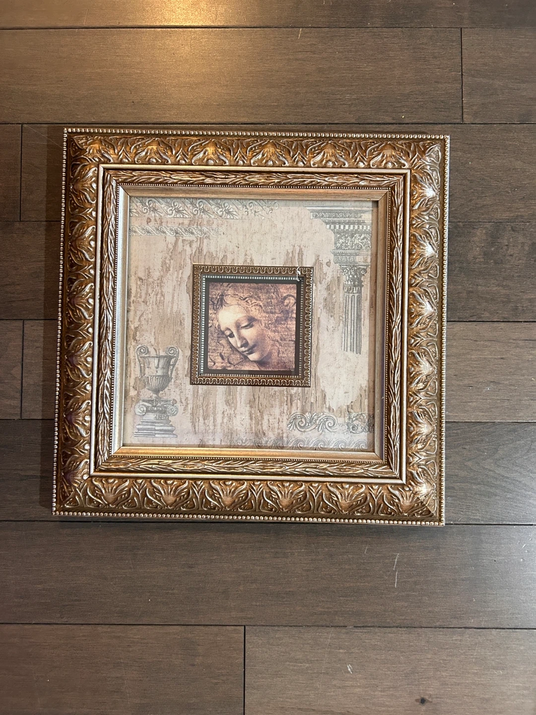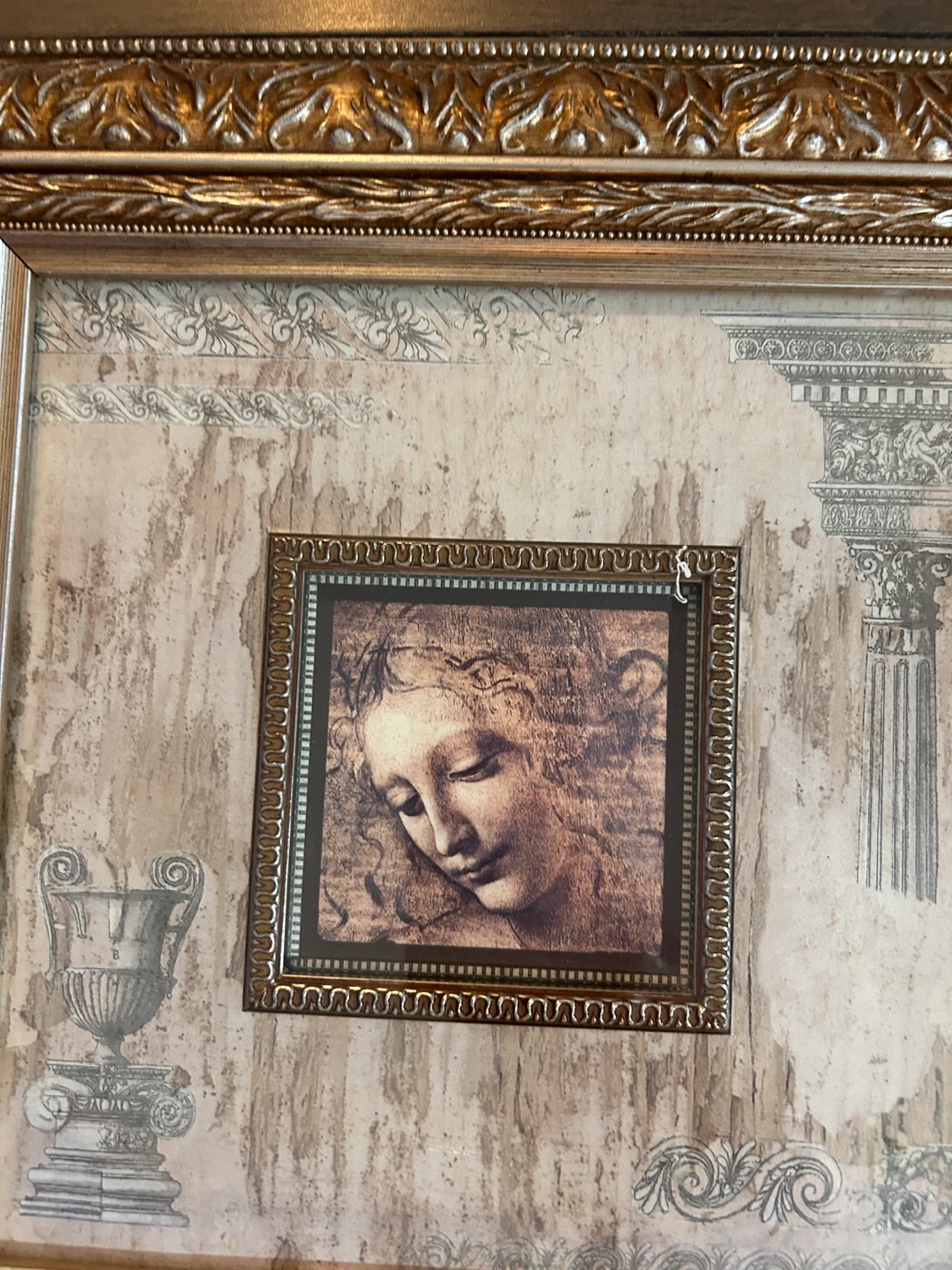 A decorative framed print featuring a classical motif. It's finished with an ornate gold-coloured frame. This piece is ready to hang and adds a touch of elegance to any room.
