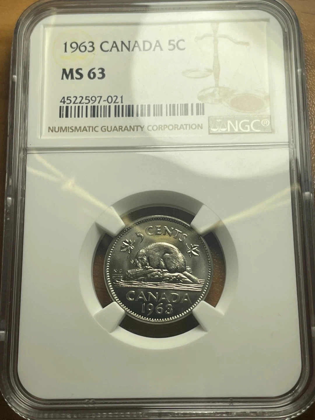 A 1963 Canadian 5-cent coin graded MS 63 by NGC. Features Queen Elizabeth II on the obverse and a beaver on the reverse. Encased in a protective NGC holder.