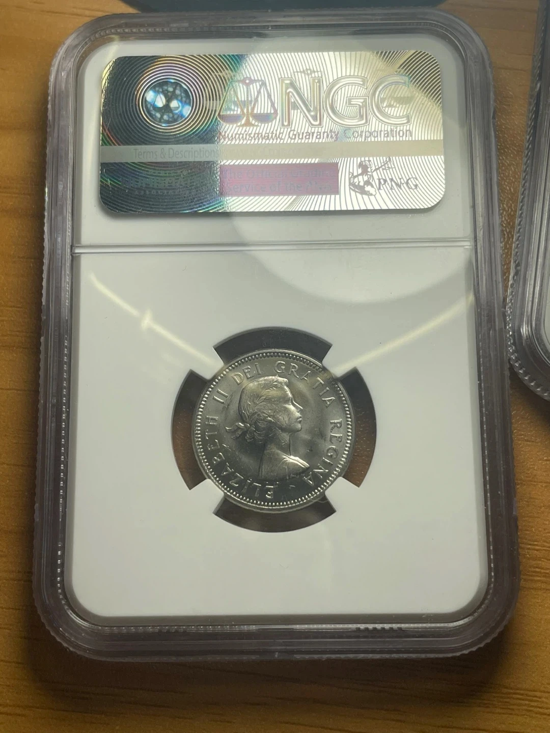 A 1963 Canadian 5-cent coin graded MS 63 by NGC. Features Queen Elizabeth II on the obverse and a beaver on the reverse. Encased in a protective NGC holder.