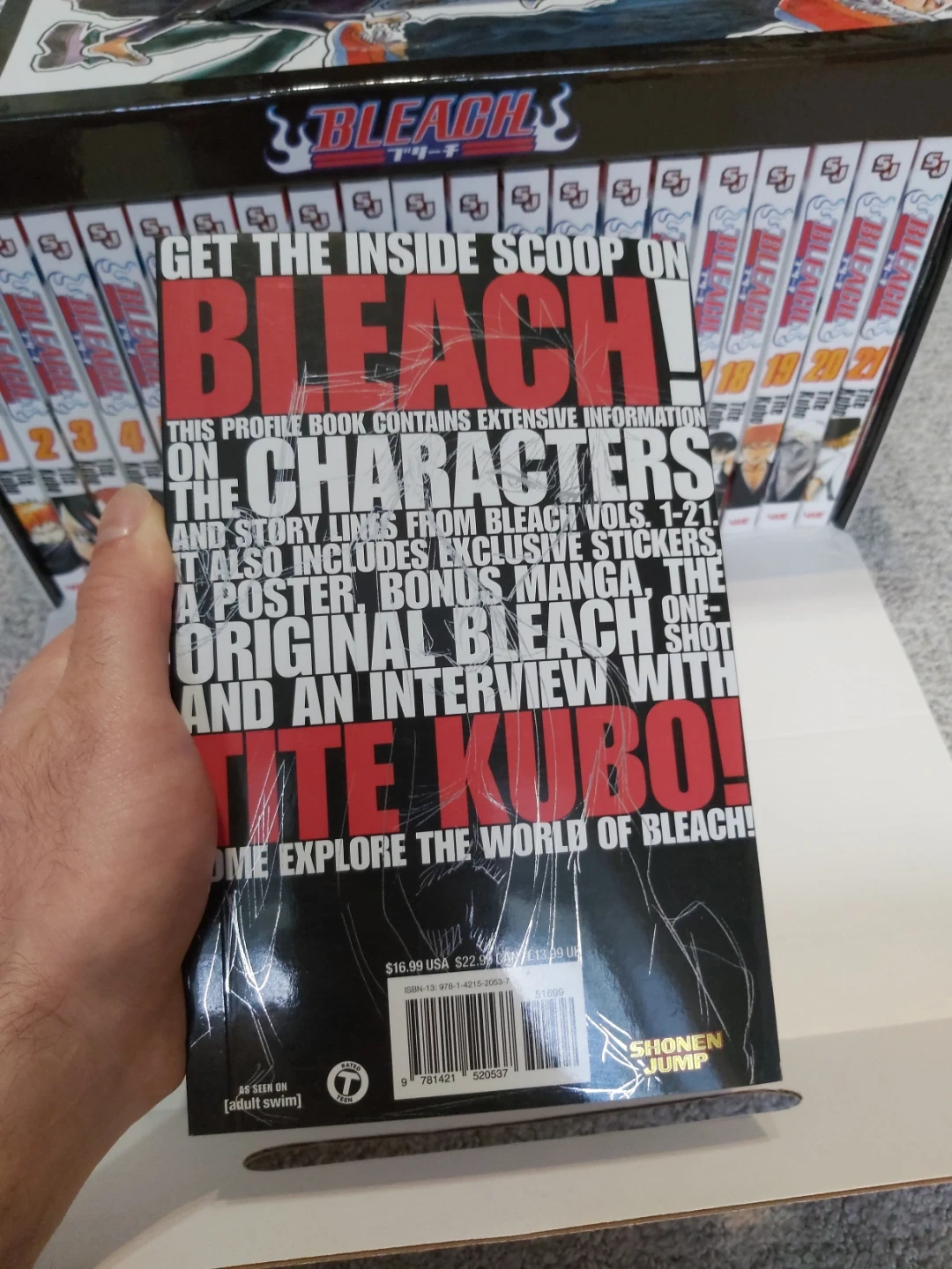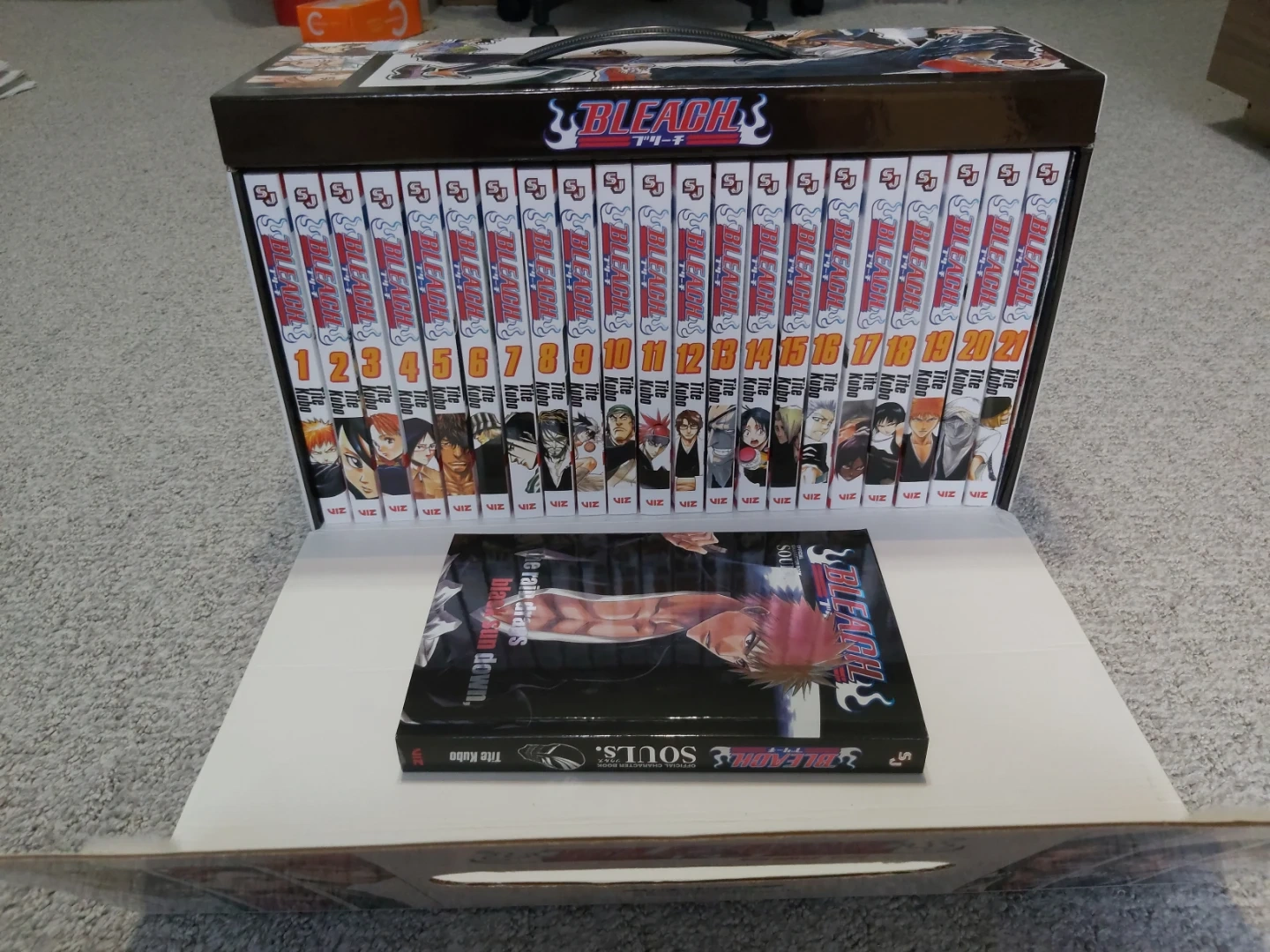 Bleach manga box set featuring volumes 1-21. It also includes a profile book with character information and story lines, exclusive stickers, a poster, bonus manga, and an interview with Tite Kubo. Published by Shonen Jump.