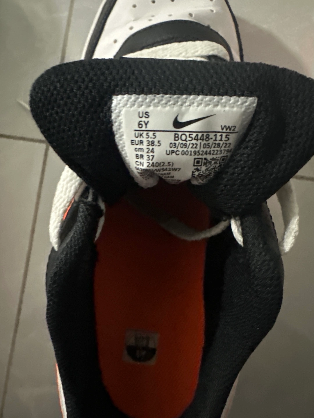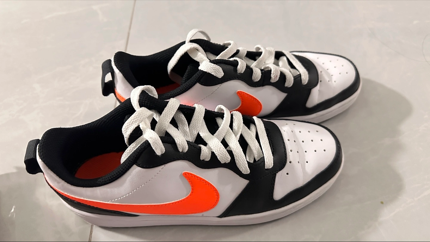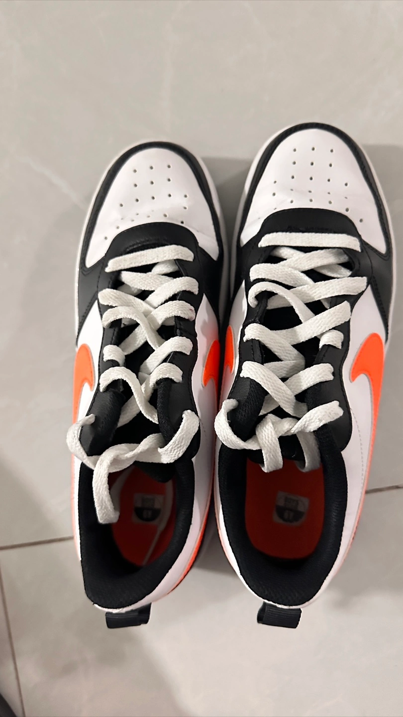 Selling a pair of Nike Court Borough Low 2 shoes in size 6Y. They feature a classic design with a white, black, and orange color scheme. The shoes are in good condition and ready for a new owner!