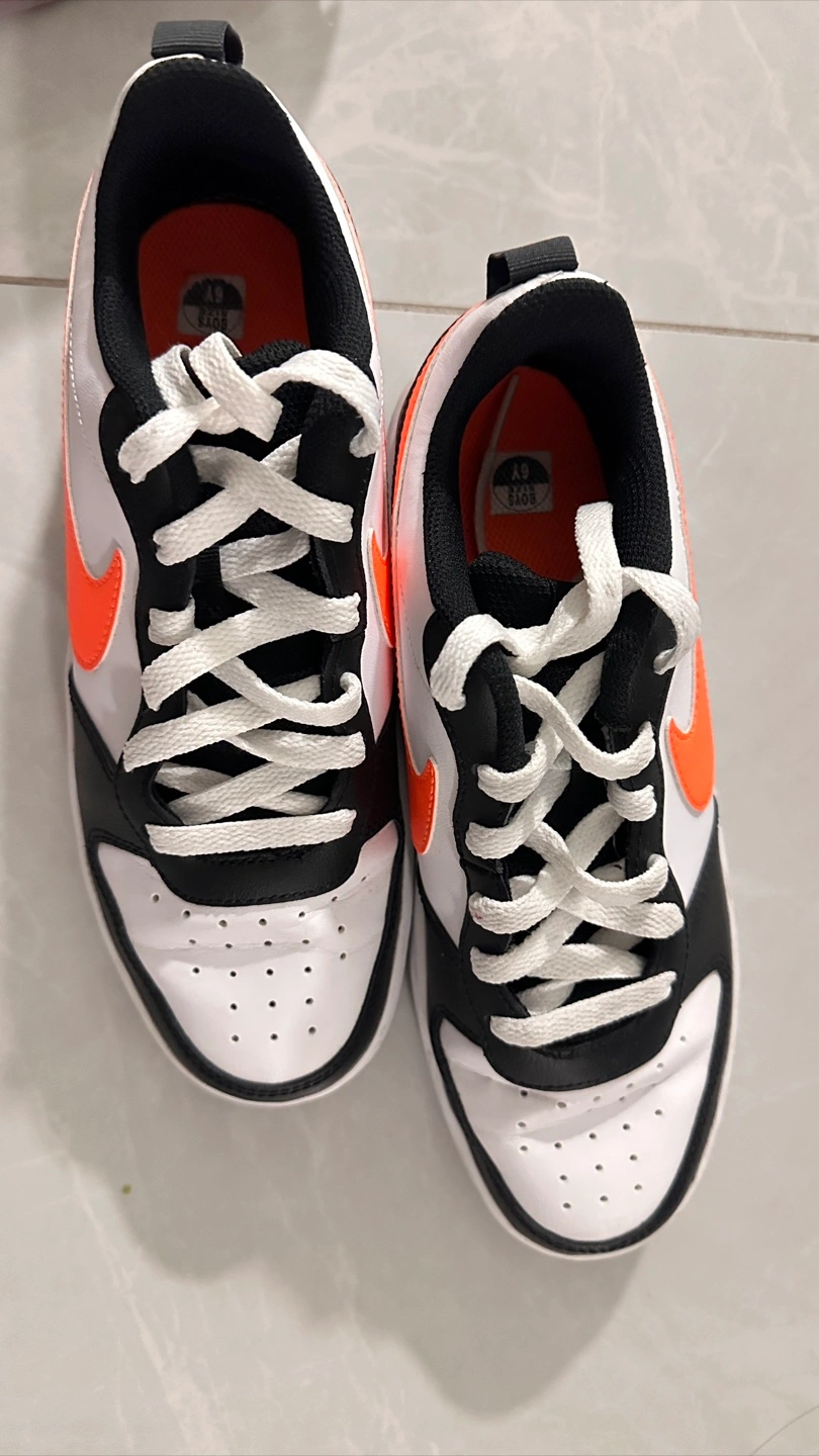 Selling a pair of Nike Court Borough Low 2 shoes in size 6Y. They feature a classic design with a white, black, and orange color scheme. The shoes are in good condition and ready for a new owner!
