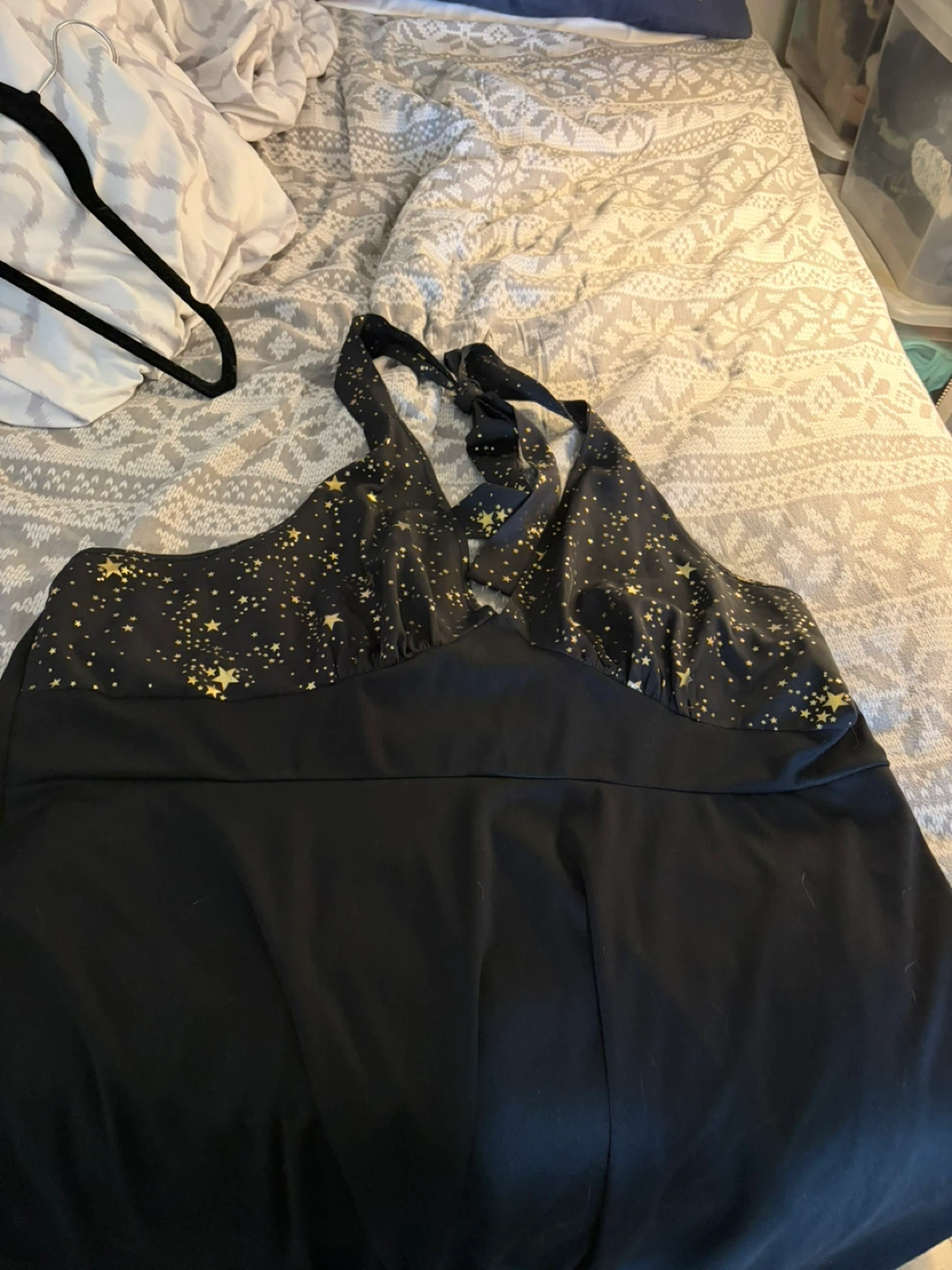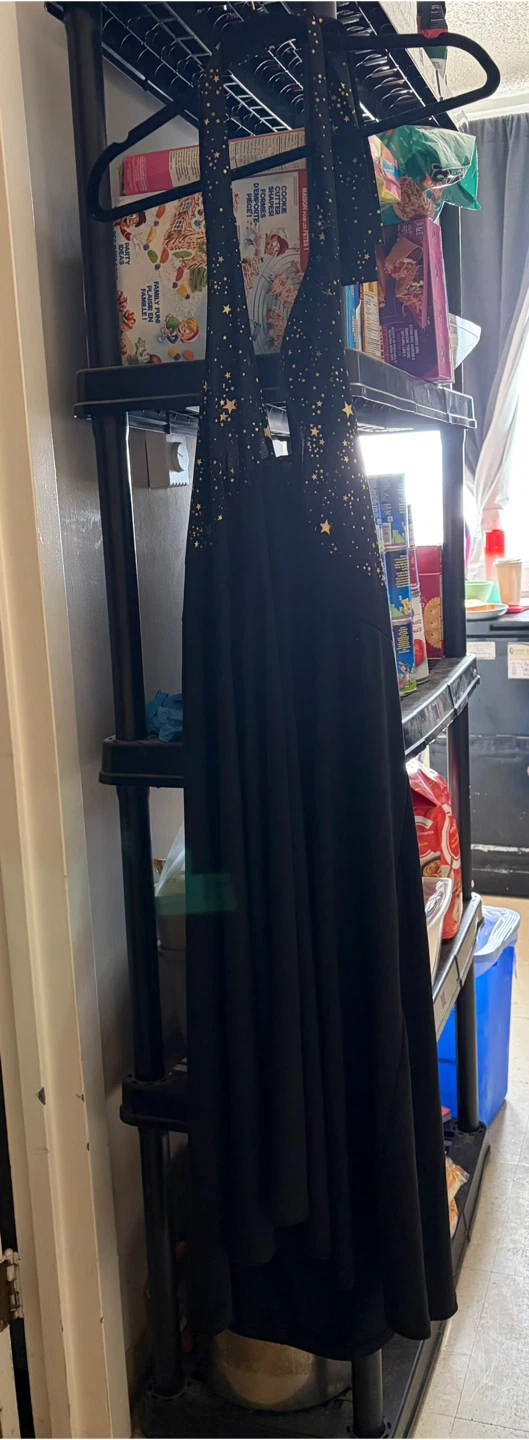 A black halter dress with gold stars around the chest and straps. Has elastic back so could possibly fit bigger.