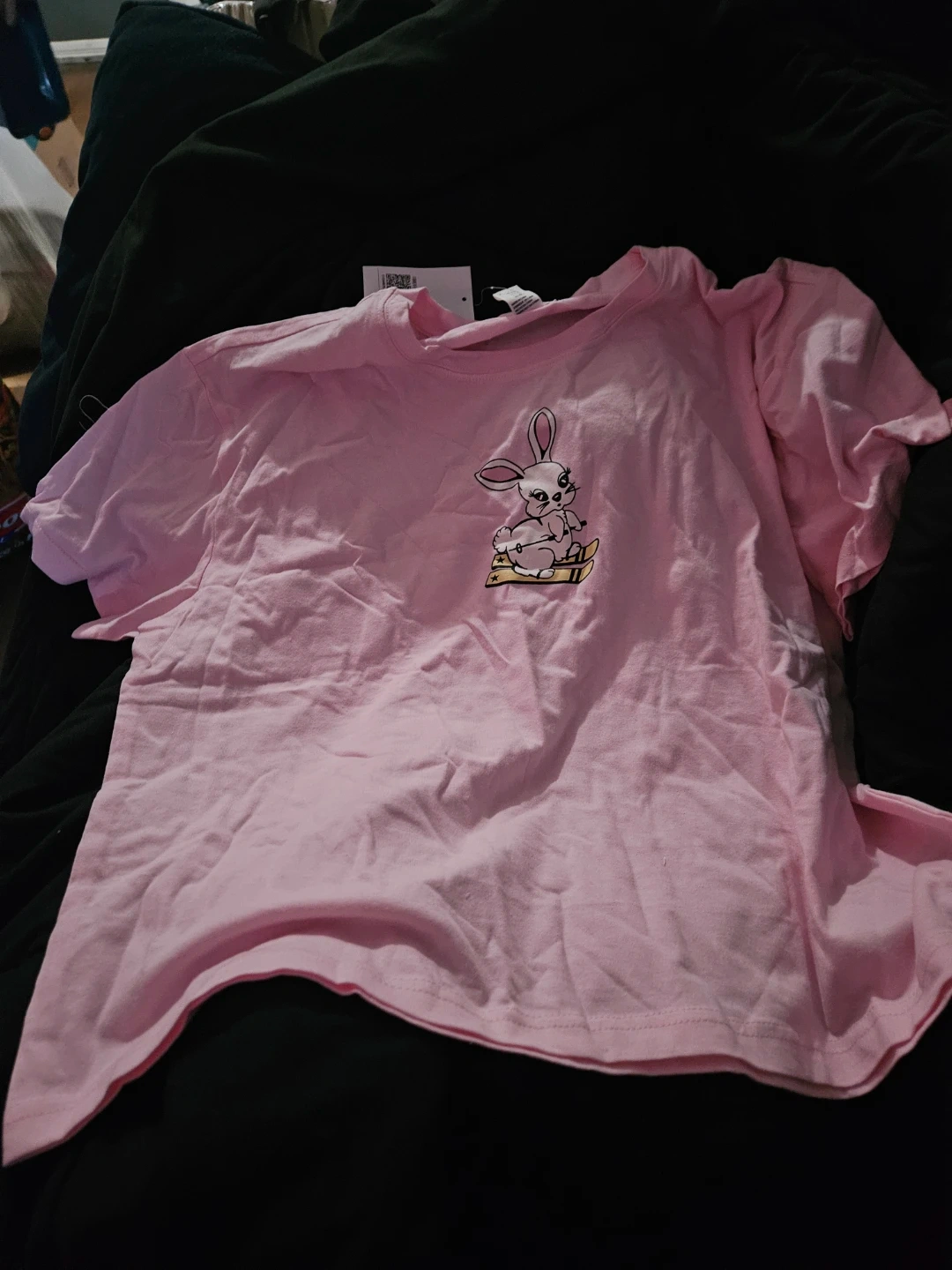 New pink pajama set from Forever 21! This set includes a short-sleeved top and shorts, both in size medium. The top features a cute bunny graphic, and the shorts have a drawstring waist for a comfortable fit