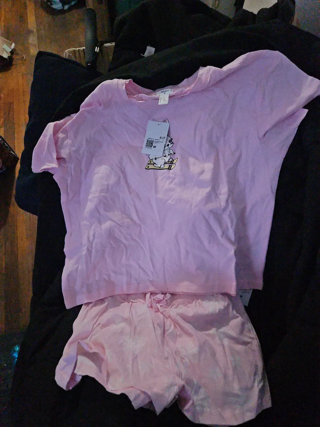 New pink pajama set from Forever 21! This set includes a short-sleeved top and shorts, both in size medium. The top features a cute bunny graphic, and the shorts have a drawstring waist for a comfortable fit