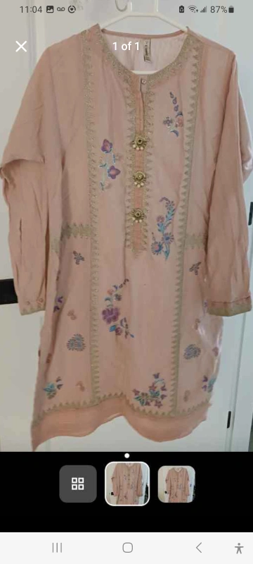 Selling a peach coloured kurti with beautiful floral embroidery. It has a button-up design and is perfect for casual wear or special occasions. It's in great condition and ready for a new home