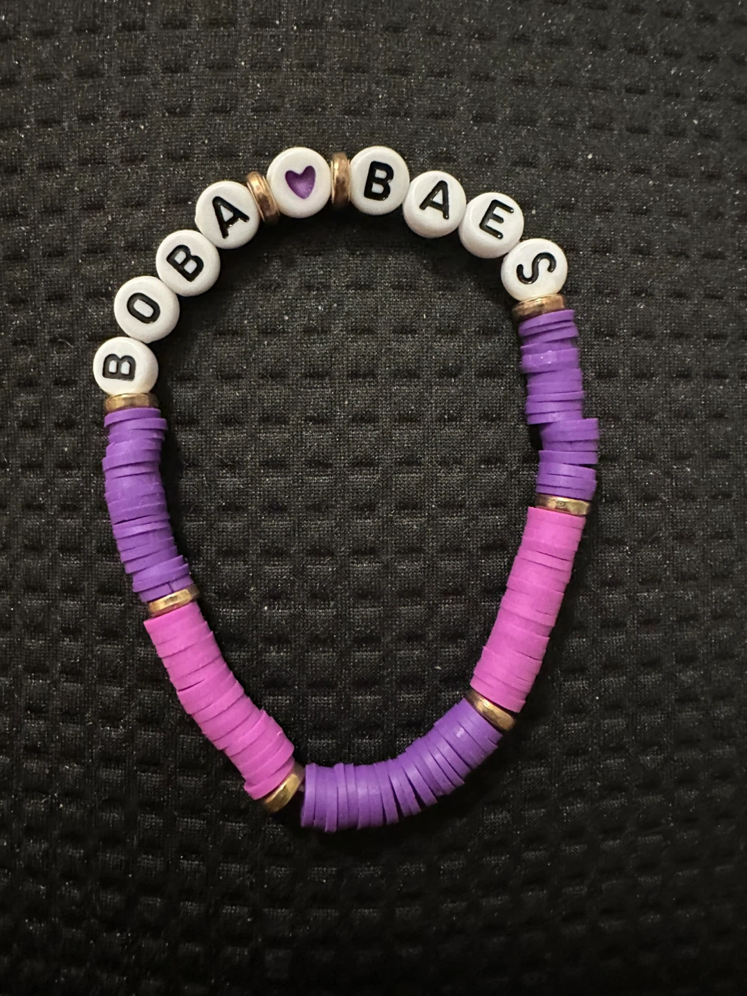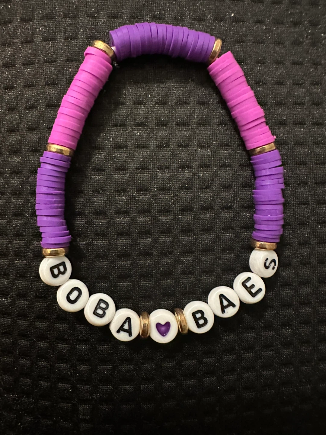 Cute beaded bracelet with pink, purple, gold and white beads! The bracelet spells out "BOBA BAES". Perfect for any boba lover.