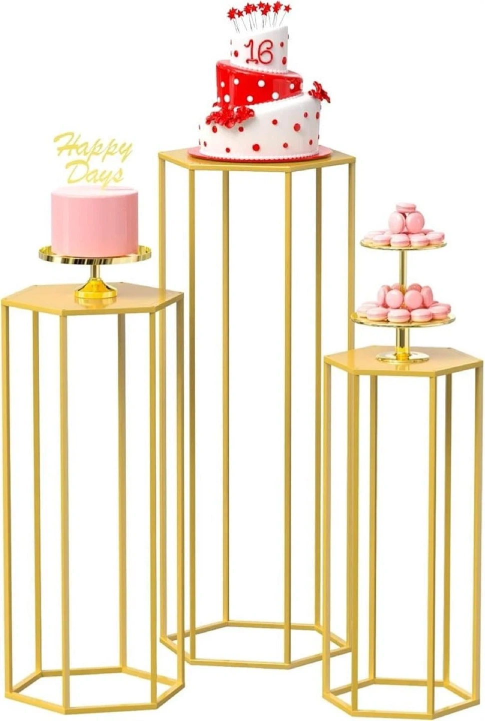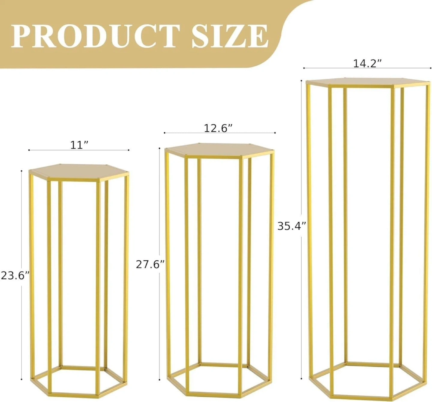 gold hexagonal pedestal stands in varying sizes. The heights are 23.6", 27.6", and 35.4" with top diameters of 11", 12.6", and 14.2" respectively. They're great for displaying cakes, desserts, or floral arrangements at parties and events. Constructed from durable metal, they offer stable support.
