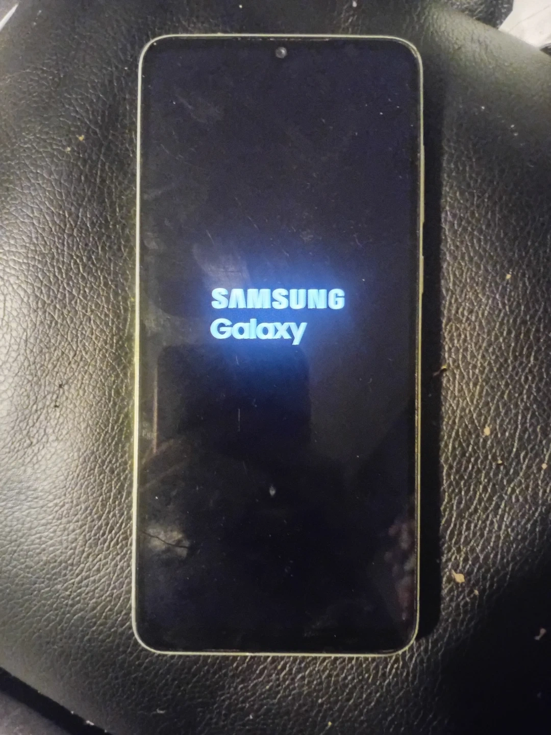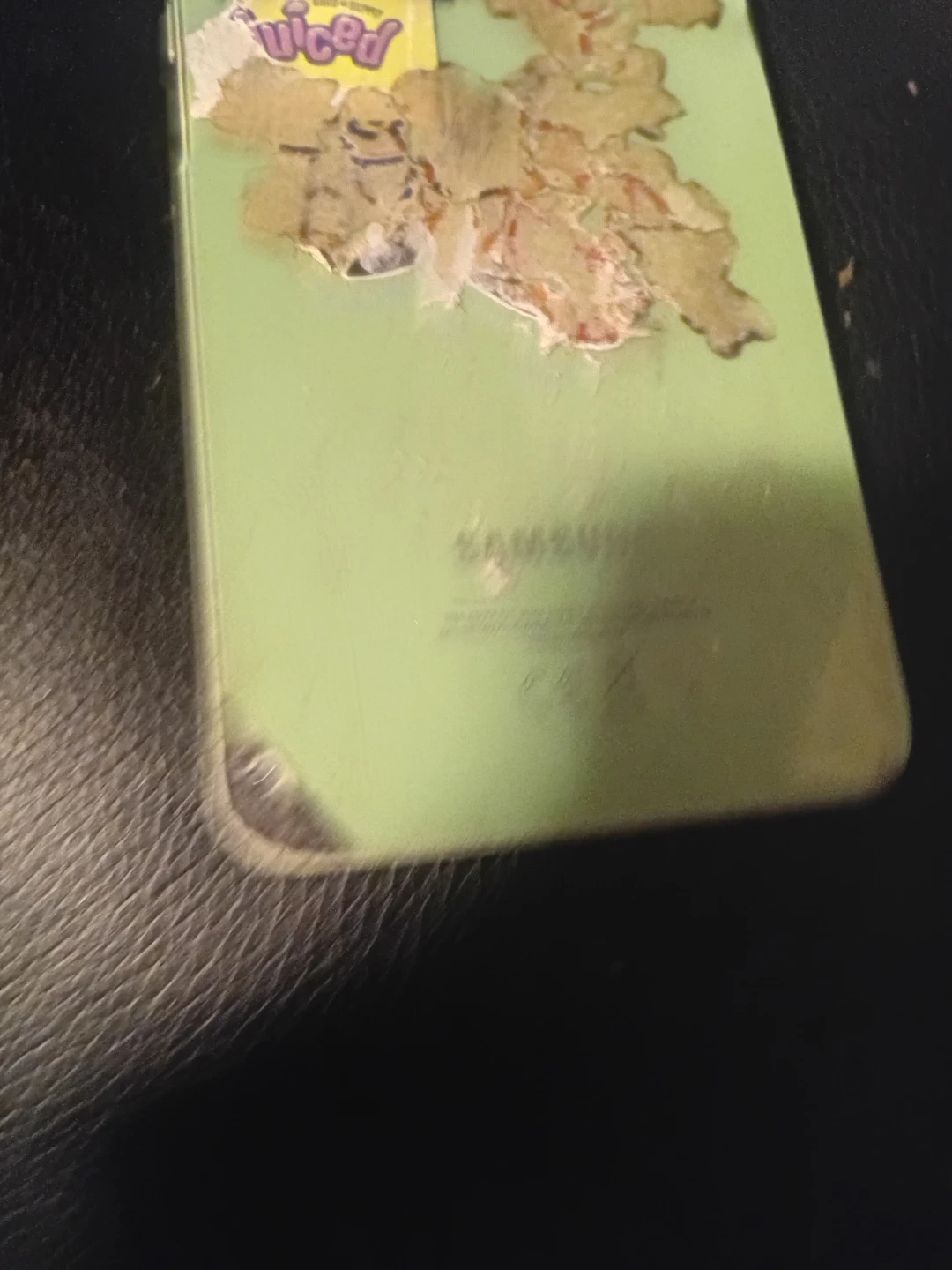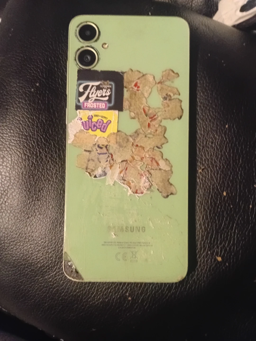 This is a green Samsung Galaxy phone. It's in used condition with stickers and some wear on the back. The screen shows the Samsung Galaxy logo, indicating it powers on. It's a functional smartphone.