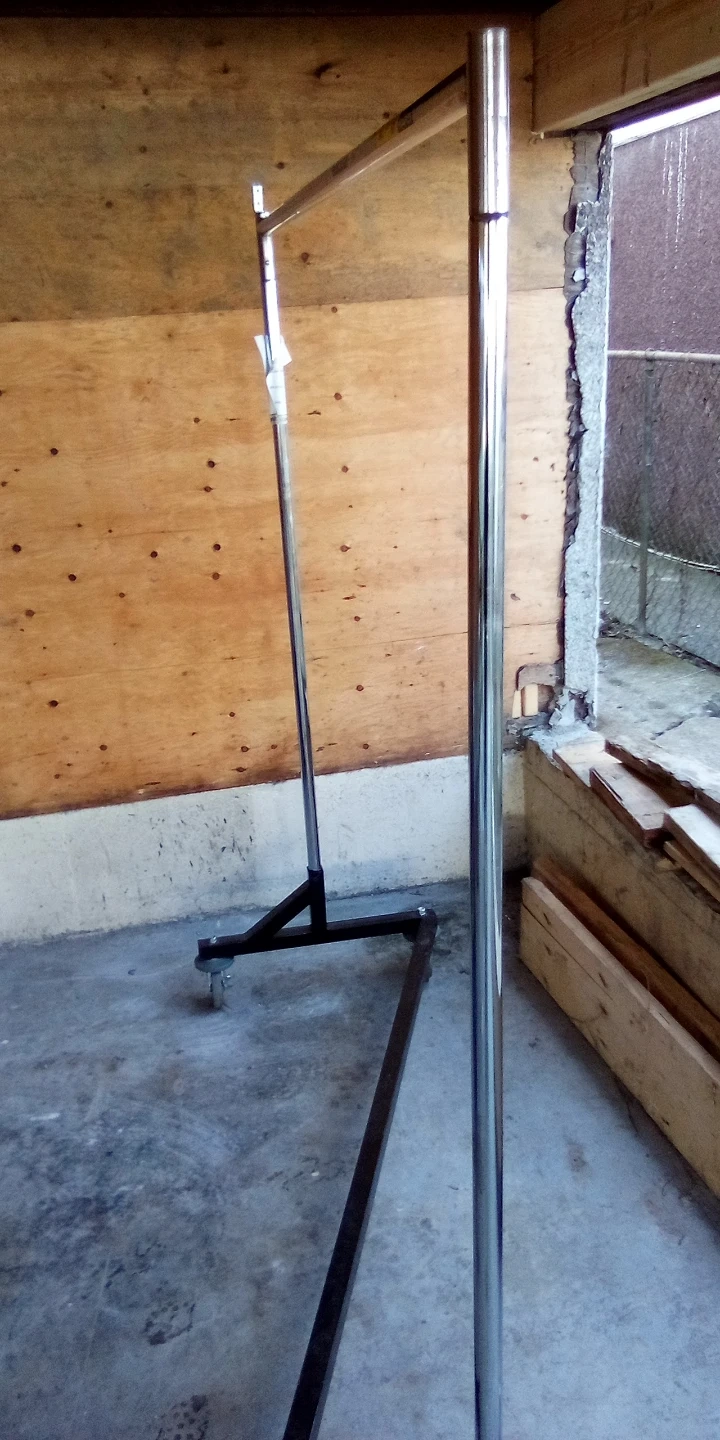 This is a rolling clothes rack with a chrome finish. It's made of metal with casters for easy movement. Ready for transport quick and easy assembly required for setup. Rack cost 130 + I'm open to offers.