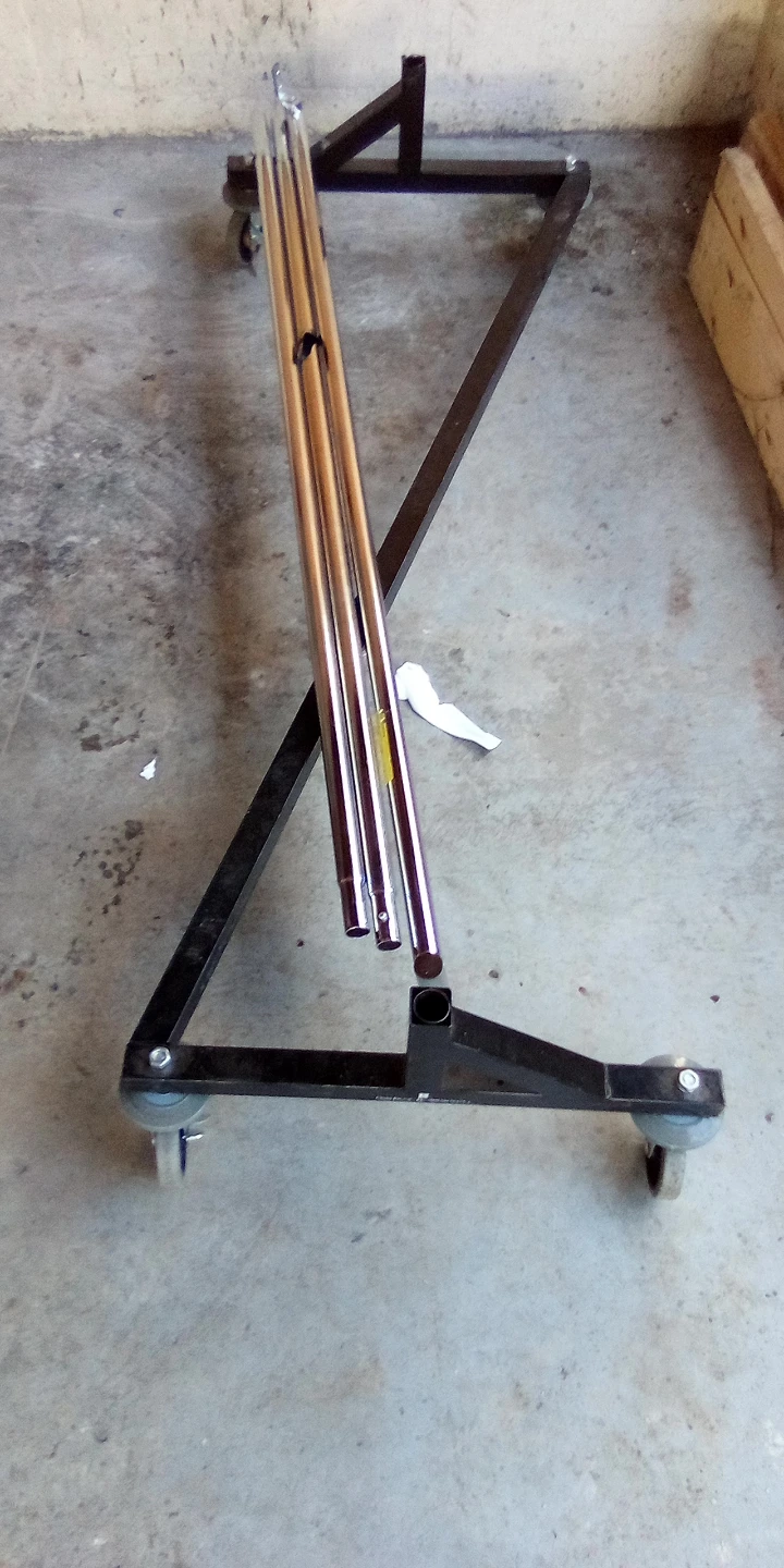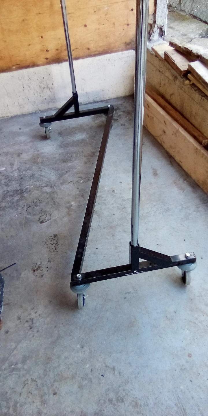 This is a rolling clothes rack with a chrome finish. It's made of metal with casters for easy movement. Ready for transport quick and easy assembly required for setup. Rack cost 130 + I'm open to offers.