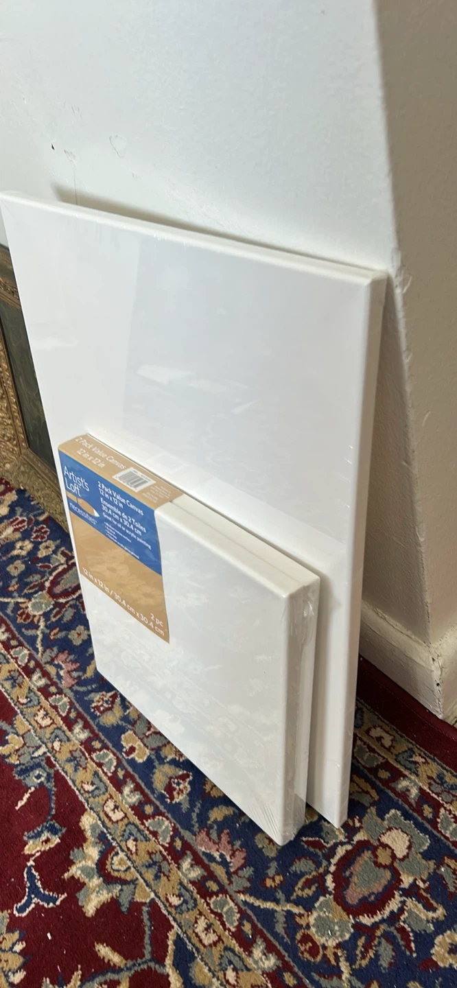 Two canvases, each measuring 12 by 12 inches. One canvas 16x20” These value canvases are ready for your oil or acrylic paintings. They're perfect for starting new art projects!