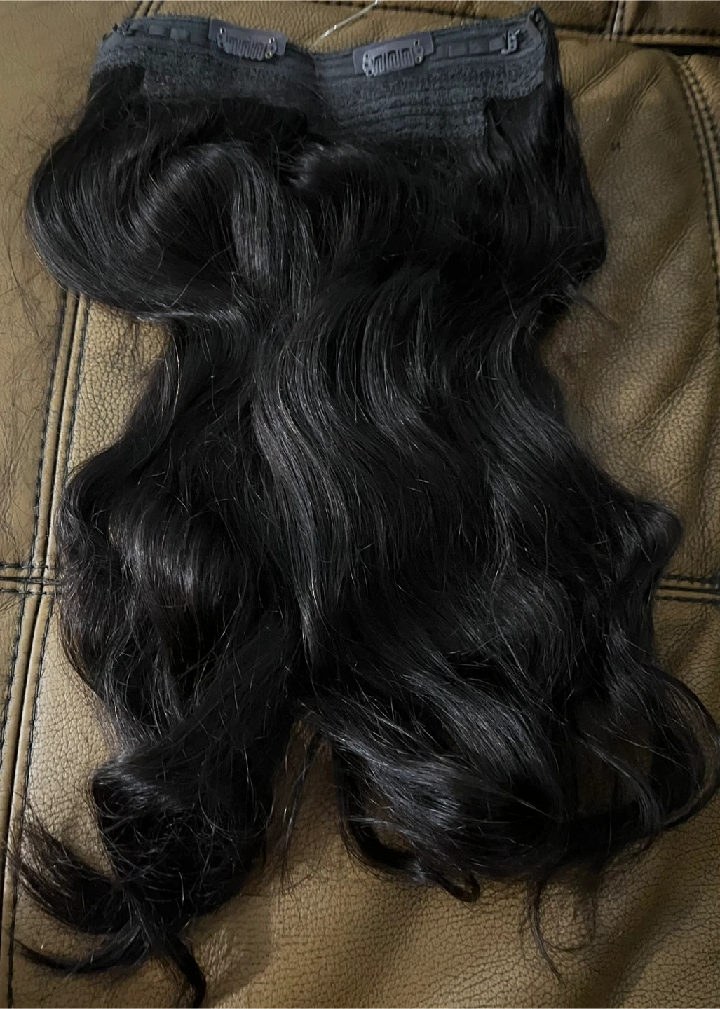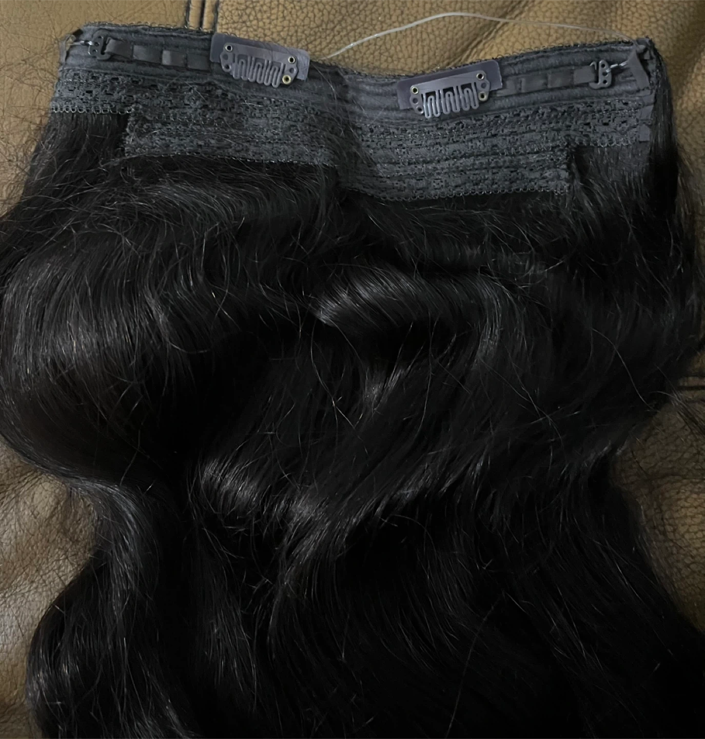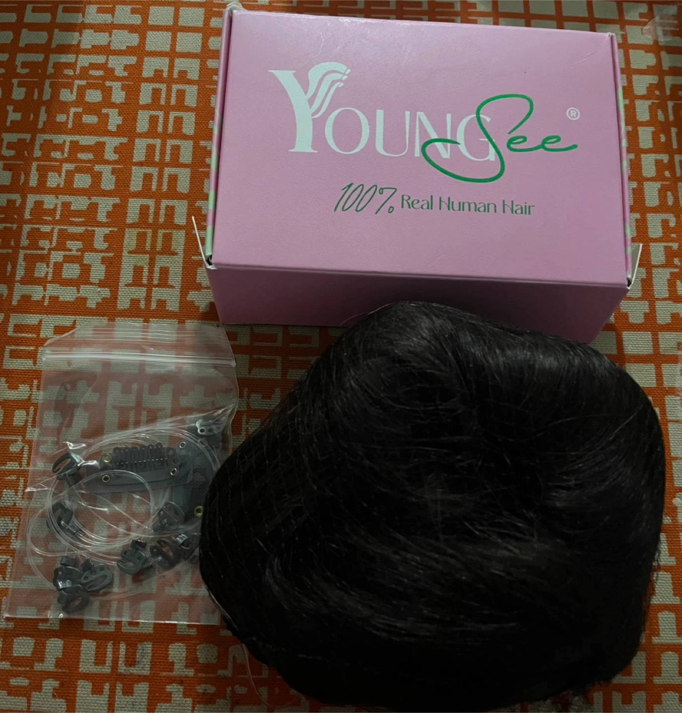 YOUNGSEE 100% real human hair extensions in black. These clip-in extensions are great for adding length and volume to your hair. Includes a set of clip-in hair extensions and accessories.