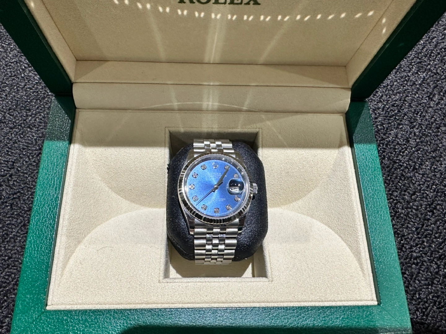 This watch has been babied since I purchased it brand new from Yorkdale Rolex in 2019 (see pics for proof) the blue face with jubilee dial was the hardest version to get at the time. This watch was only worn a few times a year to special events and comes with everything included in the pics including links which were taken off at the Rolex store on date of purchase. All original except for black watch holder which holds the watch inside the box. Price is negotiable.