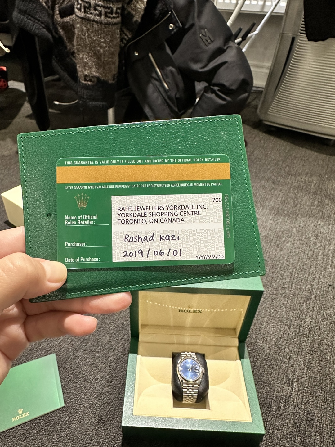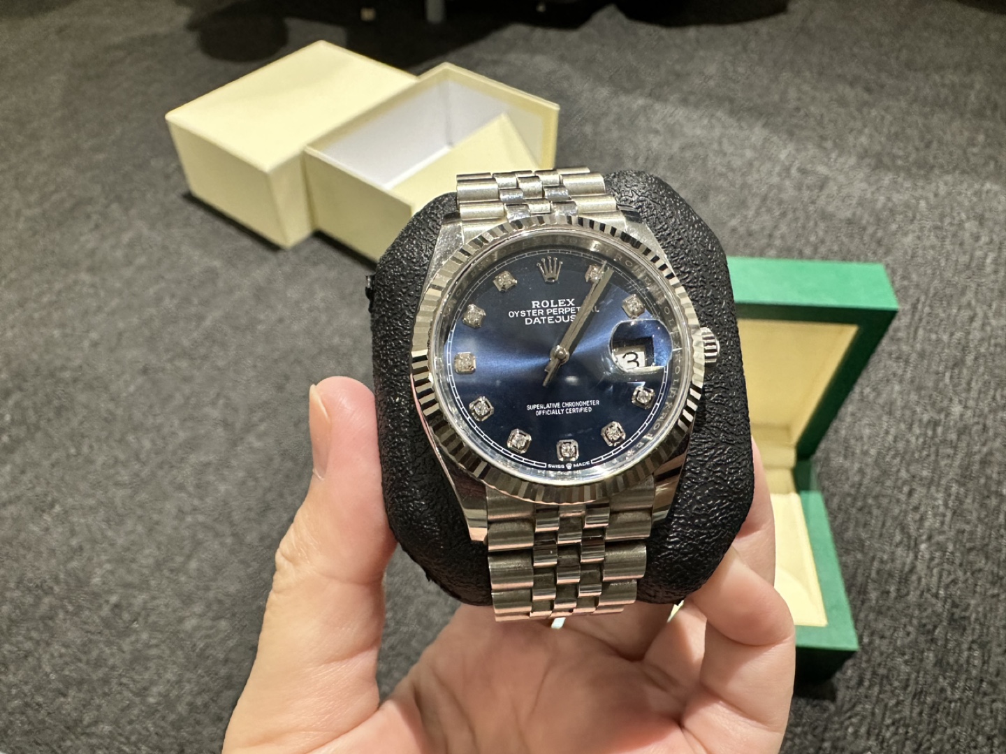 This watch has been babied since I purchased it brand new from Yorkdale Rolex in 2019 (see pics for proof) the blue face with jubilee dial was the hardest version to get at the time. This watch was only worn a few times a year to special events and comes with everything included in the pics including links which were taken off at the Rolex store on date of purchase. All original except for black watch holder which holds the watch inside the box. Price is negotiable.