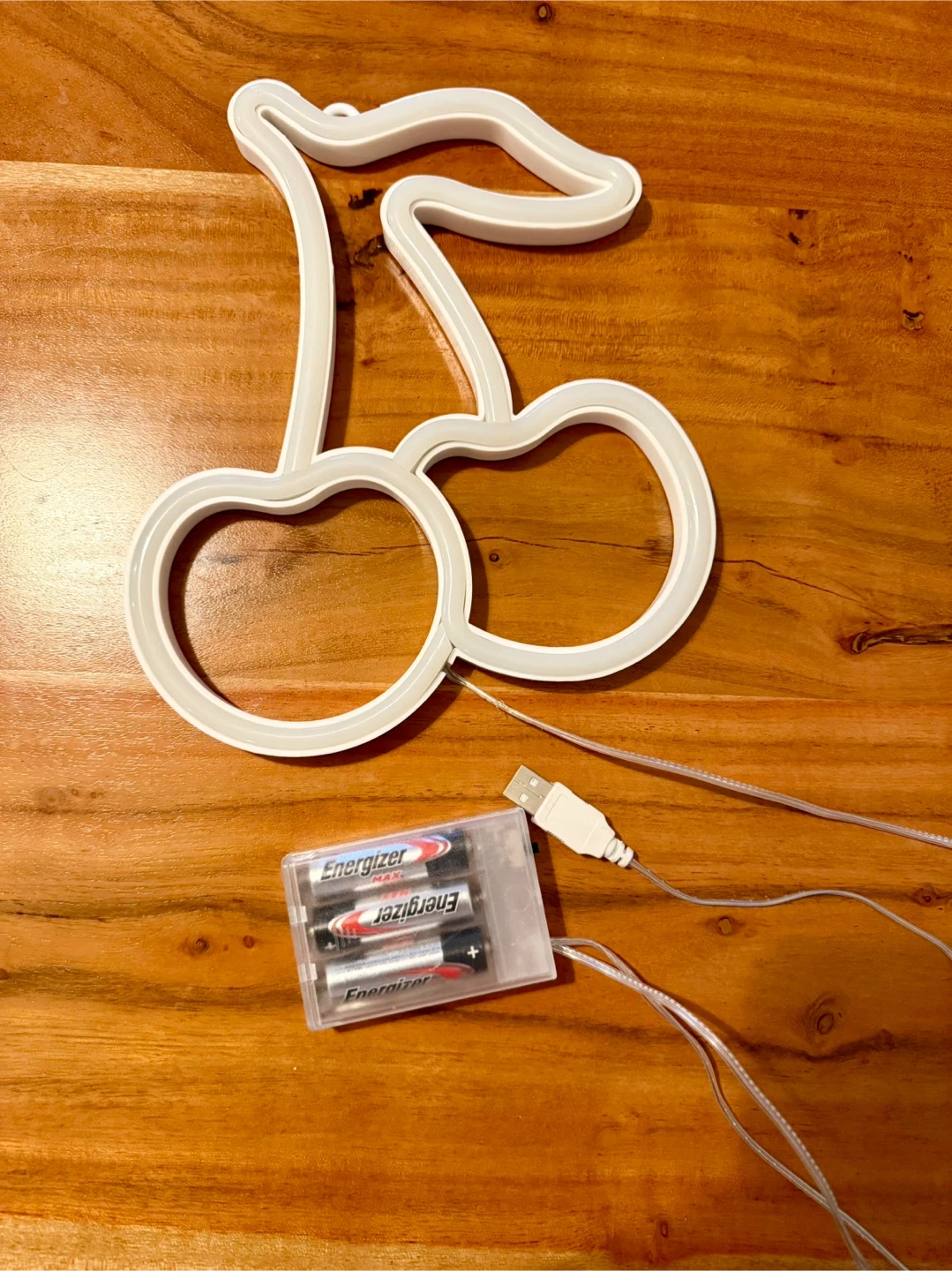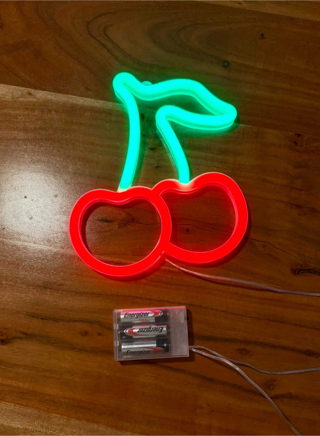 This cherry-shaped neon light gives off a fun vibe! It's powered by 3 AA batteries or USB. The light itself is bright red with a green stem, and it's sure to add a pop of colour to any room. Batteries not included.