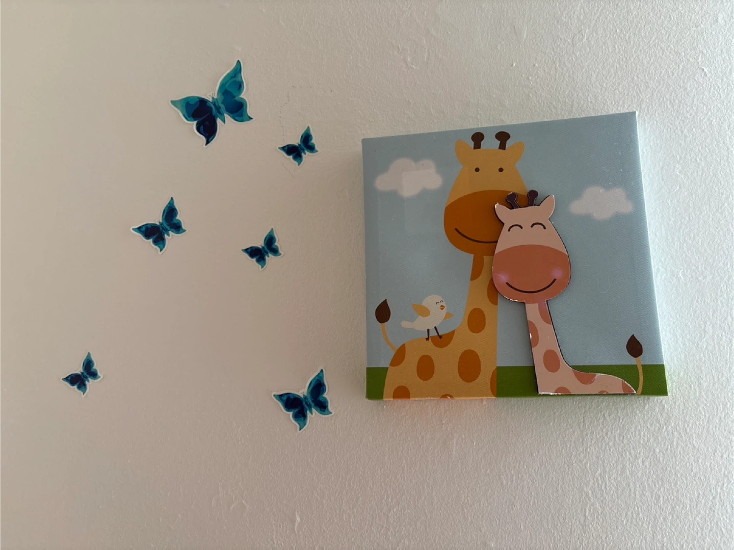 Canvas wall art featuring a mother and baby giraffe with a bird on its back. It's a sweet addition to any nursery or child's room!