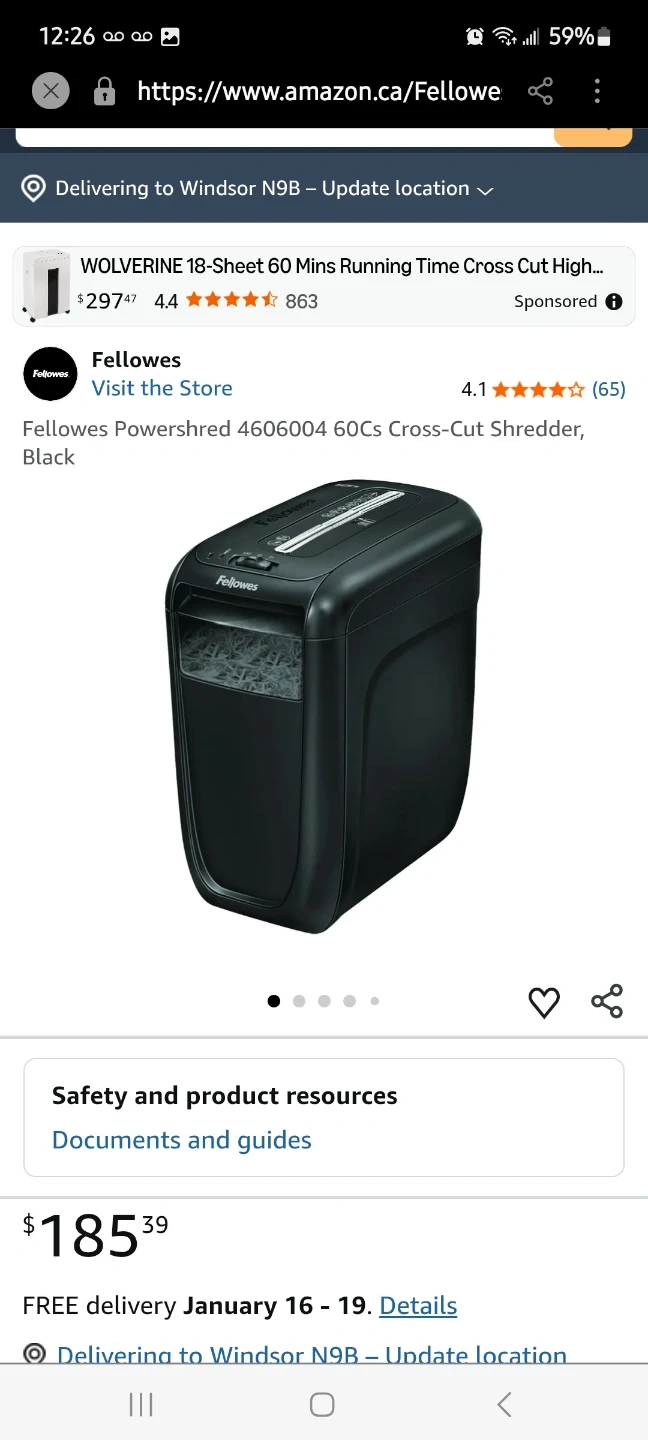 Selling a Fellowes Powershred 4606004 60Cs Cross-Cut Shredder in black. It can shred 18 sheets at a time and has a 60-minute running time. Originally bought for $185.39 call or text josh 226 935 8455