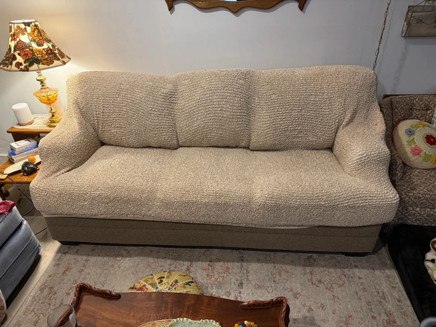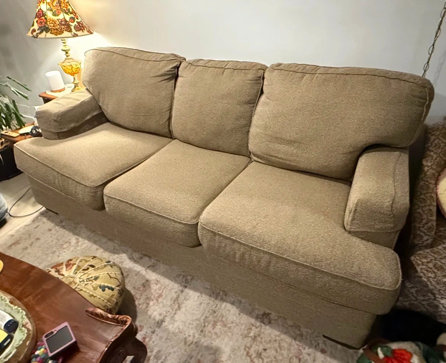 Three-seater sofa upholstered in a textured tan/brown fabric. Super comfortable and spacious couch! Cleaned regularly and always has a cover on it so its super well-kept. (Cover not included) The feet come off to fit through doorways as well. 3'(height) x7' (length) x3' (deep)
