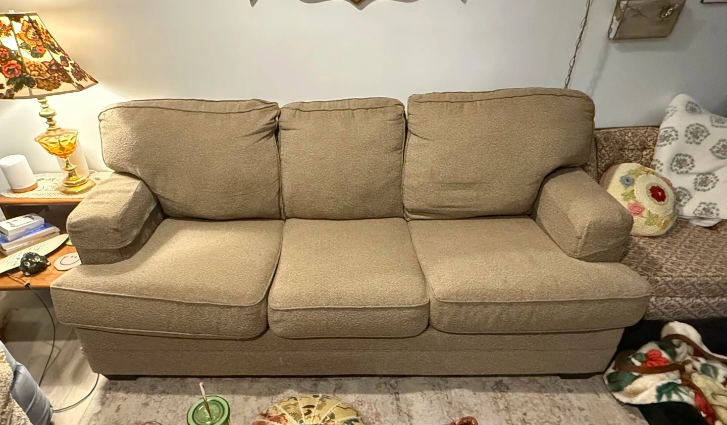 Three-seater sofa upholstered in a textured tan/brown fabric. Super comfortable and spacious couch! Cleaned regularly and always has a cover on it so its super well-kept. (Cover not included) The feet come off to fit through doorways as well. 3'(height) x7' (length) x3' (deep)