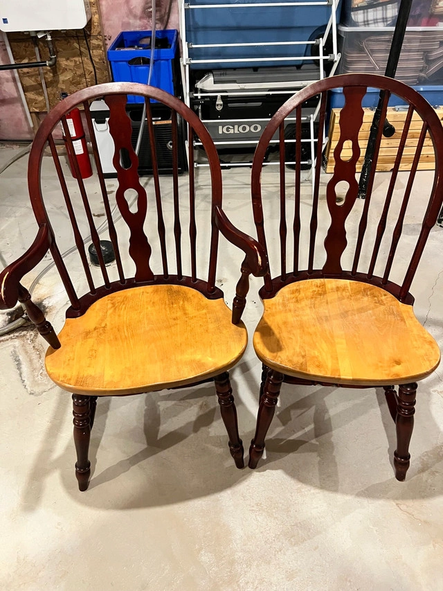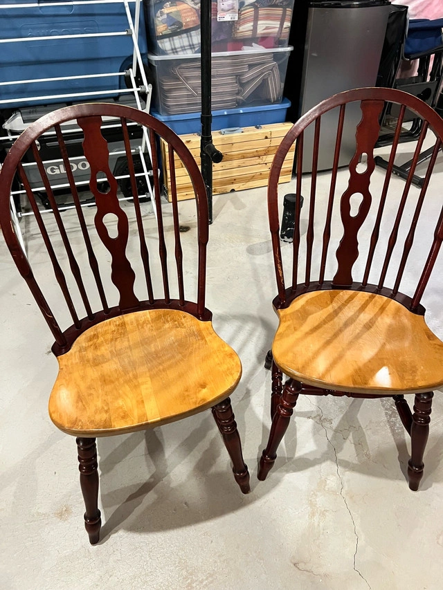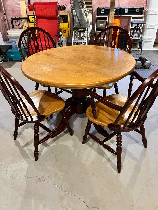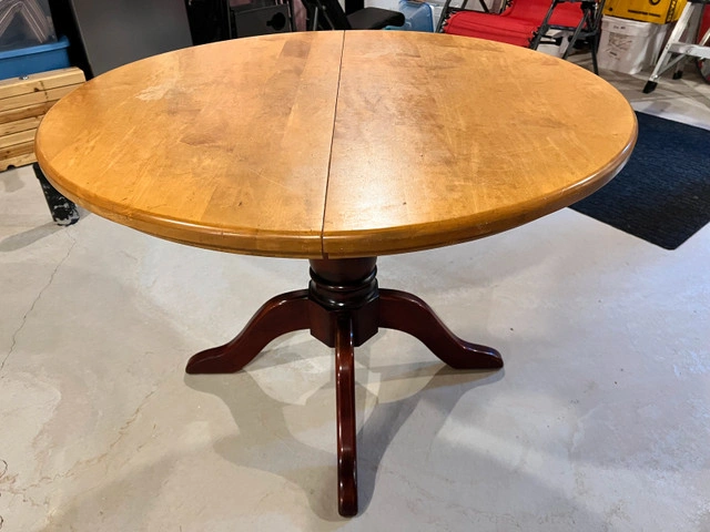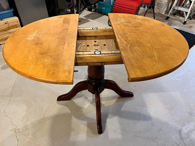This is a sturdy, used dining table with four chairs, perfect for a family. The round table can be extended to oval with 1 or 2 leaves (included) to accommodate more people. It has some wear and tear, but it has lots of life left. Table dimensions are 48 inches in diameter, and 66 inches long with the leaf installed. Chairs are all in good condition. If the ad's up, it's still available!